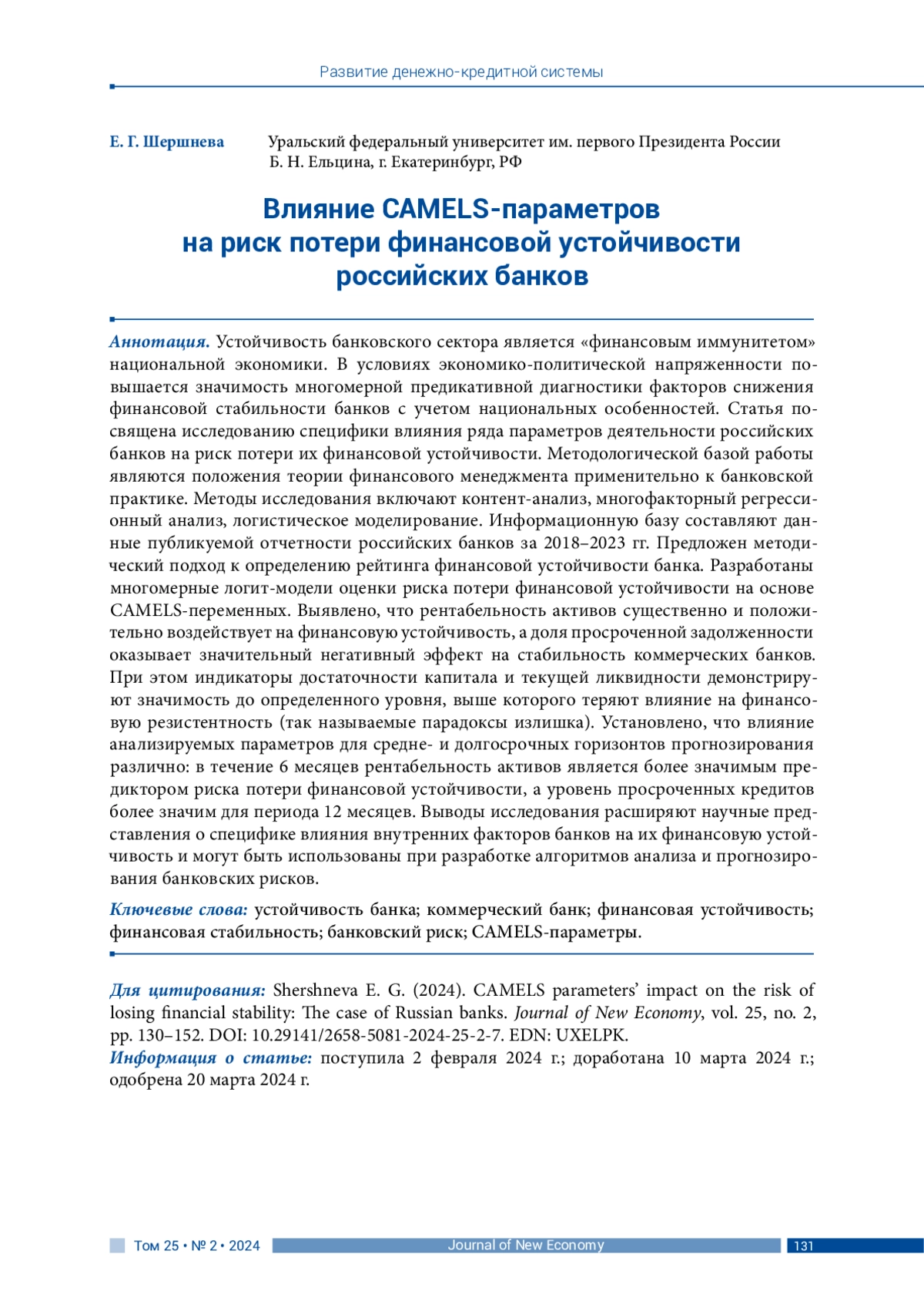54. Shershneva E. G., Bakr Hasan H. B., Al Hadabi J. (2020). Econometric modeling of the bank’s short-term liquidity dynamics based on multi-factor regression. Journal of Applied Economic Research, vol. 19, no. 1, pp. 79-96. DOI: 10.15826/vestnik.2020.19.1.005 EDN: VXARVJ