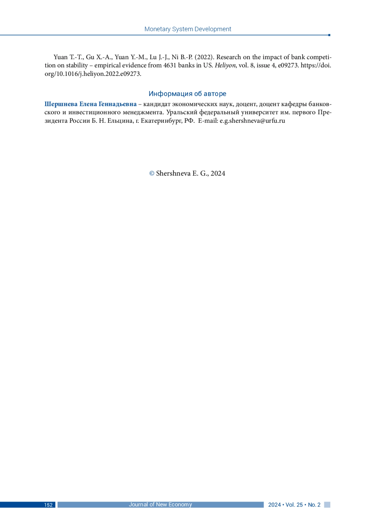 60. Yuan T.-T., Gu X.-A., Yuan Y.-M., Lu J.-J., Ni B.-P. (2022). Research on the impact of bank competition on stability - empirical evidence from 4631 banks in US. Heliyon, vol. 8, issue 4, e09273. DOI: 10.1016/j.heliyon.2022.e09273 EDN: RRSWMB
