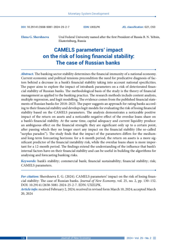 The banking sector stability determines the financial immunity of a national economy. Current economic and political tensions precondition the need for predicative diagnosis of factors behind a decrease in a bank’s financial stability taking into account national specificities. The paper aims to explore the impact of intrabank parameters on a risk of deteriorated financial stability of Russian banks. The methodological basis of the study is the theory of financial management as applied to the banking practice. The research methods include content analysis, multiple regression, and logit modelling. The evidence comes from the published financial statements of Russian banks for 2018–2023. The paper suggests an approach for rating banks according to their financial stability and develops logit models for evaluating the risk of losing financial stability based on the CAMELS parameters. The analysis demonstrates a noticeable positive impact of the return on assets and a noticeable negative effect of the overdue loans share on a bank’s financial stability. At the same time, capital adequacy and current liquidity produce an ambiguous effect on the financial strength: they are significant only up to a certain point, after passing which they no longer exert any impact on the financial stability (the so-called “surplus paradox”). The study finds that the impact of the parameters differs for the mediumand long-term forecasting horizons: for a 6-month period, the return on assets is a more significant predictor of the financial instability risk, while the overdue loans share is more important for a 12-month period. The findings extend the understanding of the influence that bank’s internal factors have on their financial stability and can be useful in building the algorithms for analysing and forecasting banking risks