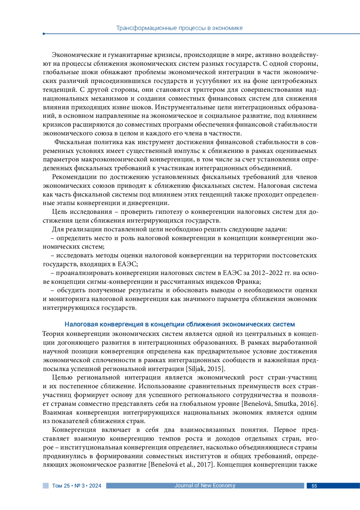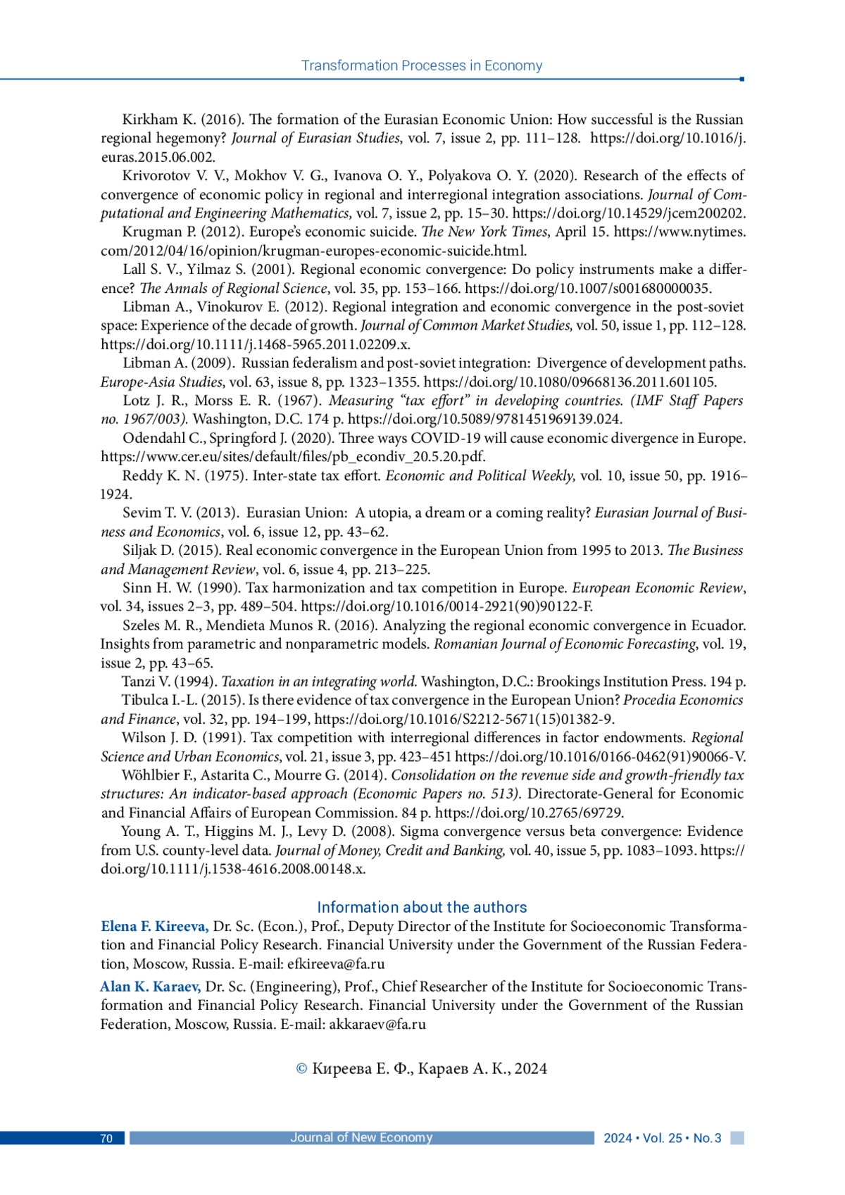 КИРЕЕВА Е. Ф., КАРАЕВ А. К. НАЛОГОВАЯ КОНВЕРГЕНЦИЯ В СИСТЕМЕ ЭКОНОМИЧЕСКОЙ ИНТЕГРАЦИИ: ТЕНДЕНЦИИ В ПОСТКОВИДНЫЙ ПЕРИОД // JOURNAL OF NEW ECONOMY. 2024. Т. 25 № 3
