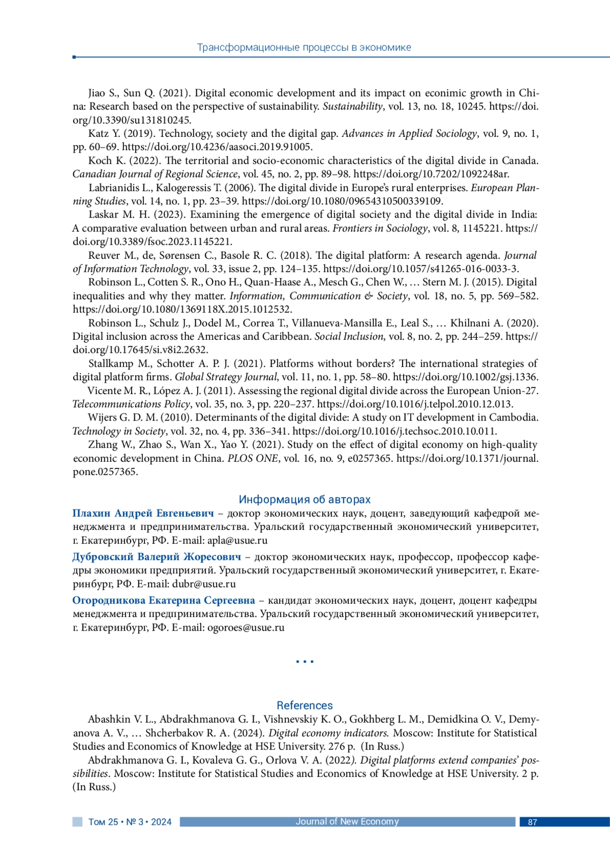 11. Коковихин А. Ю., Плахин А. Е., Огородникова Е. С. (2023). Факторы интенсивности использования цифровых платформ населением Российской Федерации // Journal of Applied Economic Research. Т. 22, № 4. С. 1087-1112. DOI: 10.15826/vestnik.2023.22.4.042 EDN: IWLAFI