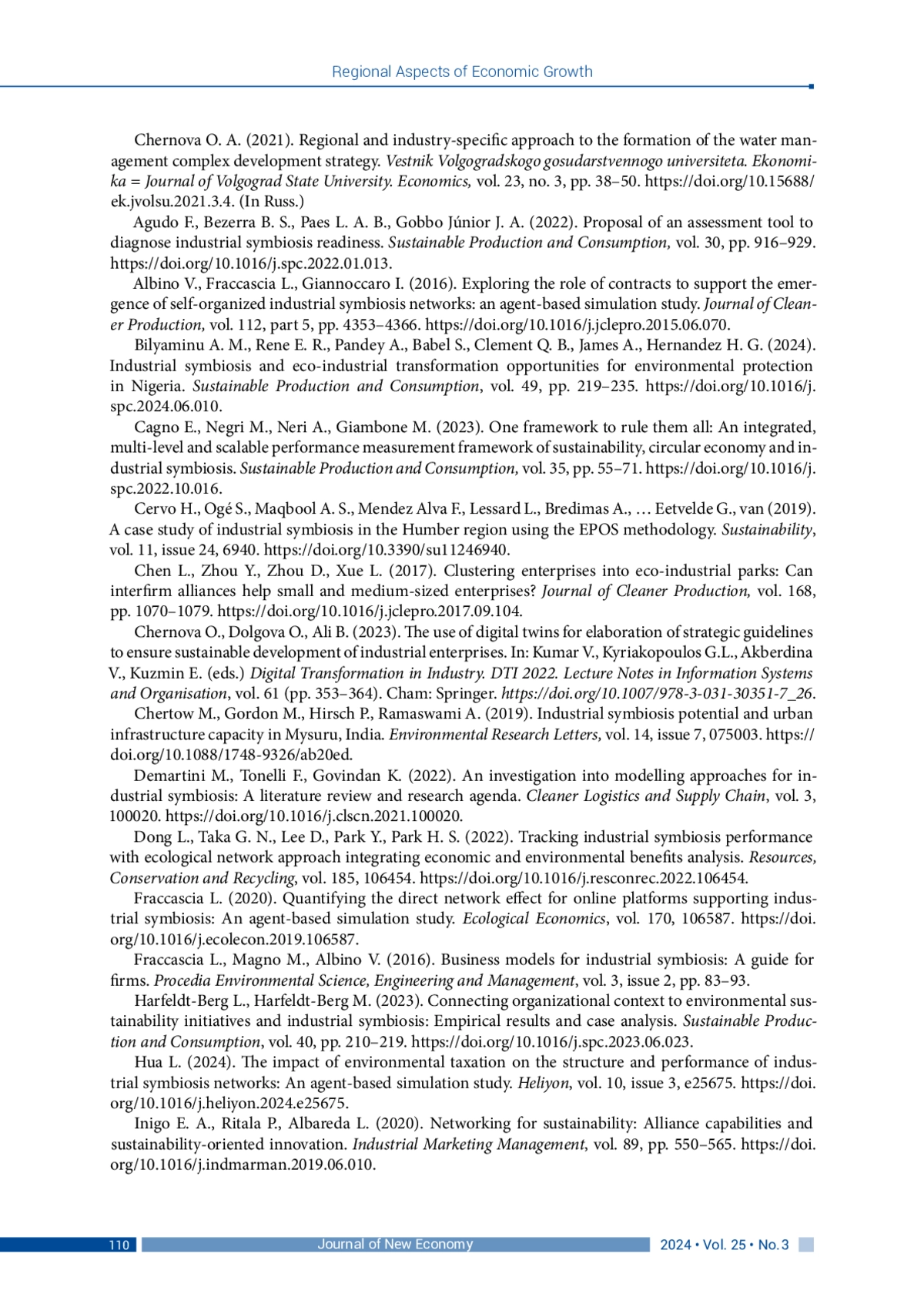 28. Hua L. (2024). The impact of environmental taxation on the structure and performance of industrial symbiosis networks: An agent-based simulation study. Heliyon, vol. 10, issue 3, e25675. DOI: 10.1016/j.heliyon.2024.e25675 EDN: SPQCVT