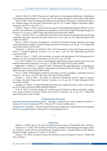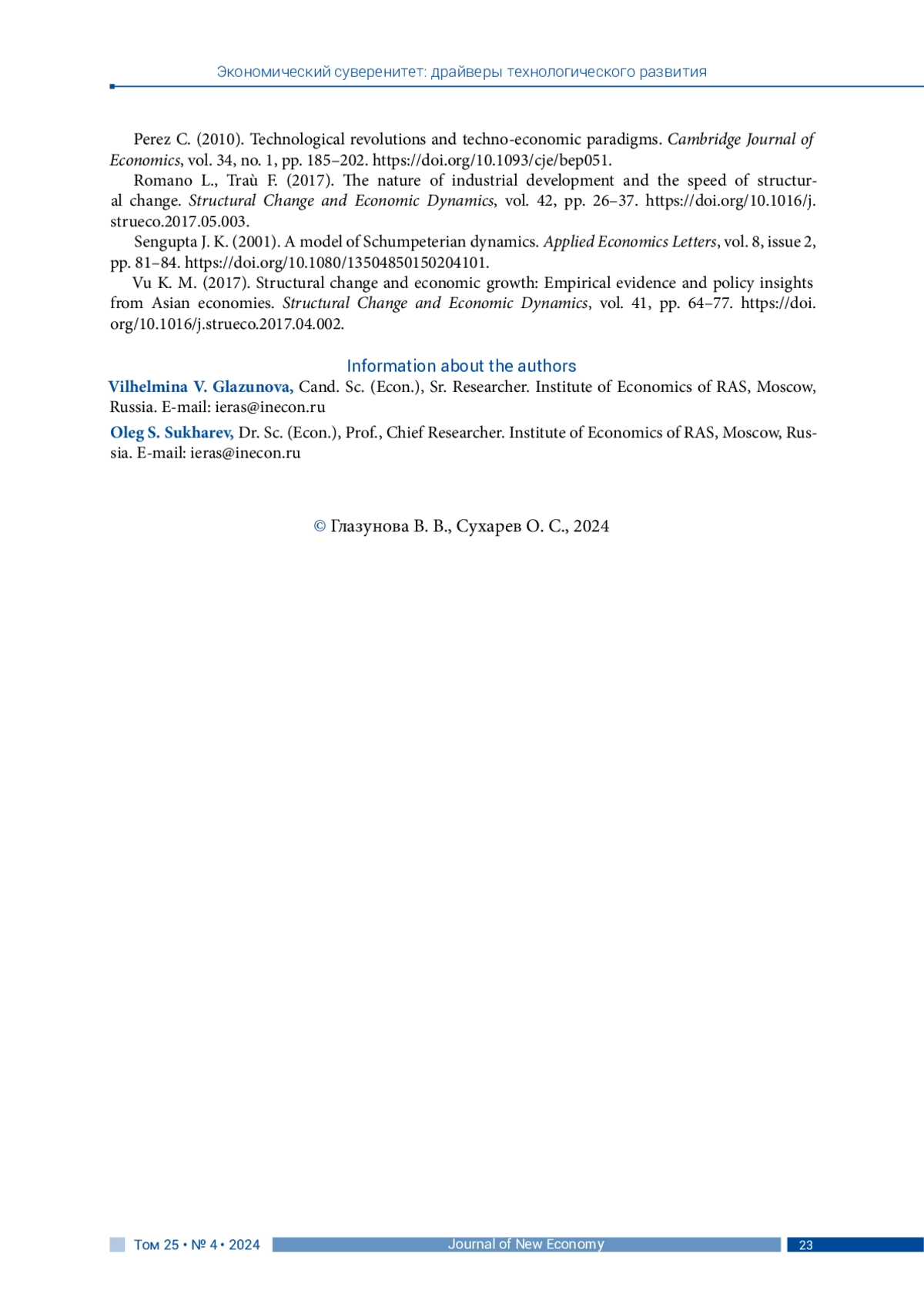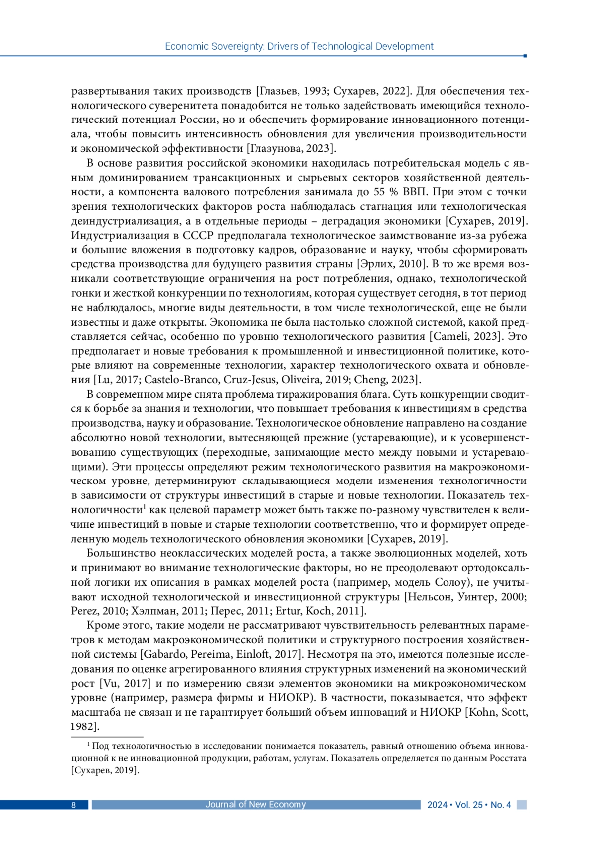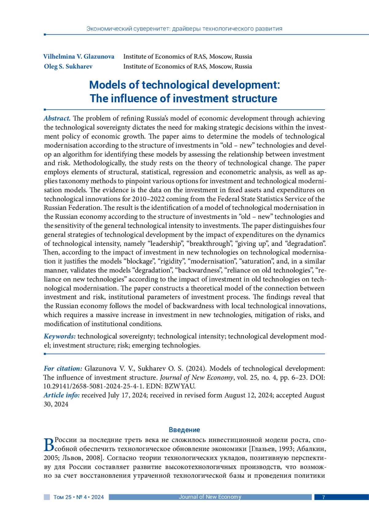 ГЛАЗУНОВА В. В., СУХАРЕВ О. С. МОДЕЛИ ТЕХНОЛОГИЧЕСКОГО РАЗВИТИЯ: ВЛИЯНИЕ СТРУКТУРЫ ИНВЕСТИЦИЙ // JOURNAL OF NEW ECONOMY. 2024. Т. 25 № 4