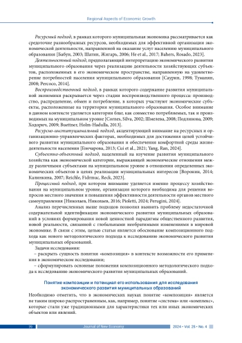 В настоящее время идет формирование научной парадигмы муниципальной экономики: происходит поиск и обсуждение различных теорий и концепций исследования муниципальных образований. В этой связи актуальной становится проблема разработки релевантного методологического инструментария исследования экономического развития муниципальных образований. В науке имеются устоявшиеся подходы к изучению вопросов муниципальной экономики и местного хозяйства, однако, расширение предметного поля региональной и муниципальной экономики требует предложения новых. Статья посвящена обоснованию нового методологического подхода к исследованию экономического развития муниципальных образований – композиционного. Методологической основой статьи послужили теории регионального развития, парадигма муниципальной экономики, а также пространственный, эволюционный и системный подходы. Использовался комплекс общенаучных методов, включая обзор, компаративный анализ и систематизацию. Раскрыта сущность понятия «композиция» и представлены аргументы, подтверждающие целесообразность его использования в дискурсе региональной экономики. Сформулированы принципы композиционного методологического подхода к исследованию экономического развития муниципальных образований: равновесия, динамизма, единства и соподчинения, целостности, гармонии. Композиционный методологический подход базируется на трех составляющих его методологиях: пространственно-временной, эволюционной и системной, применение которых в совокупности позволило через композиционные принципы концептуализировать основные положения исследования экономического развития муниципальных образований. Разработанный композиционный подход предоставит возможность сформировать методологическую основу исследования экономического развития муниципальных образований в условиях новой ценностной парадигмы