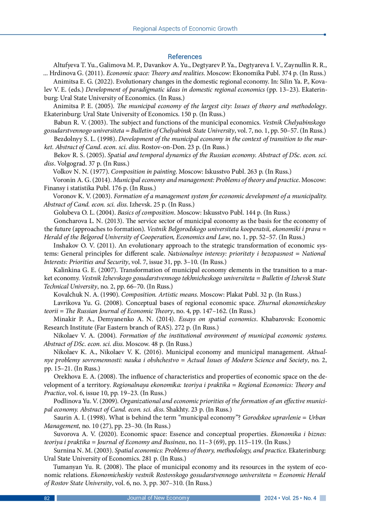 2. Анимица Е. Г. (2022). Эволюционные изменения в отечественной региональной экономике // Развитие парадигмальных идей в отечественной региональной экономике: монография / под ред. Я. П. Силина, В. Е. Ковалева. Екатеринбург: Уральский государственный экономический университет. С. 13-23. EDN: UBMDXL