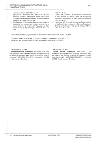 11. Чернус Н.Ю., Войтович Е.П., Воронина С.В. Особенности раздела некоторых видов имущества супругов // Известия Алтайского государственного университета. 2017. № 6. С. 86. EDN: ZWHBNL