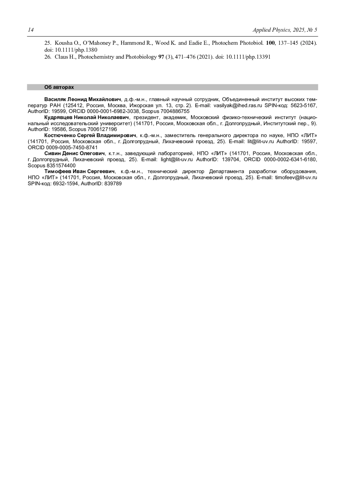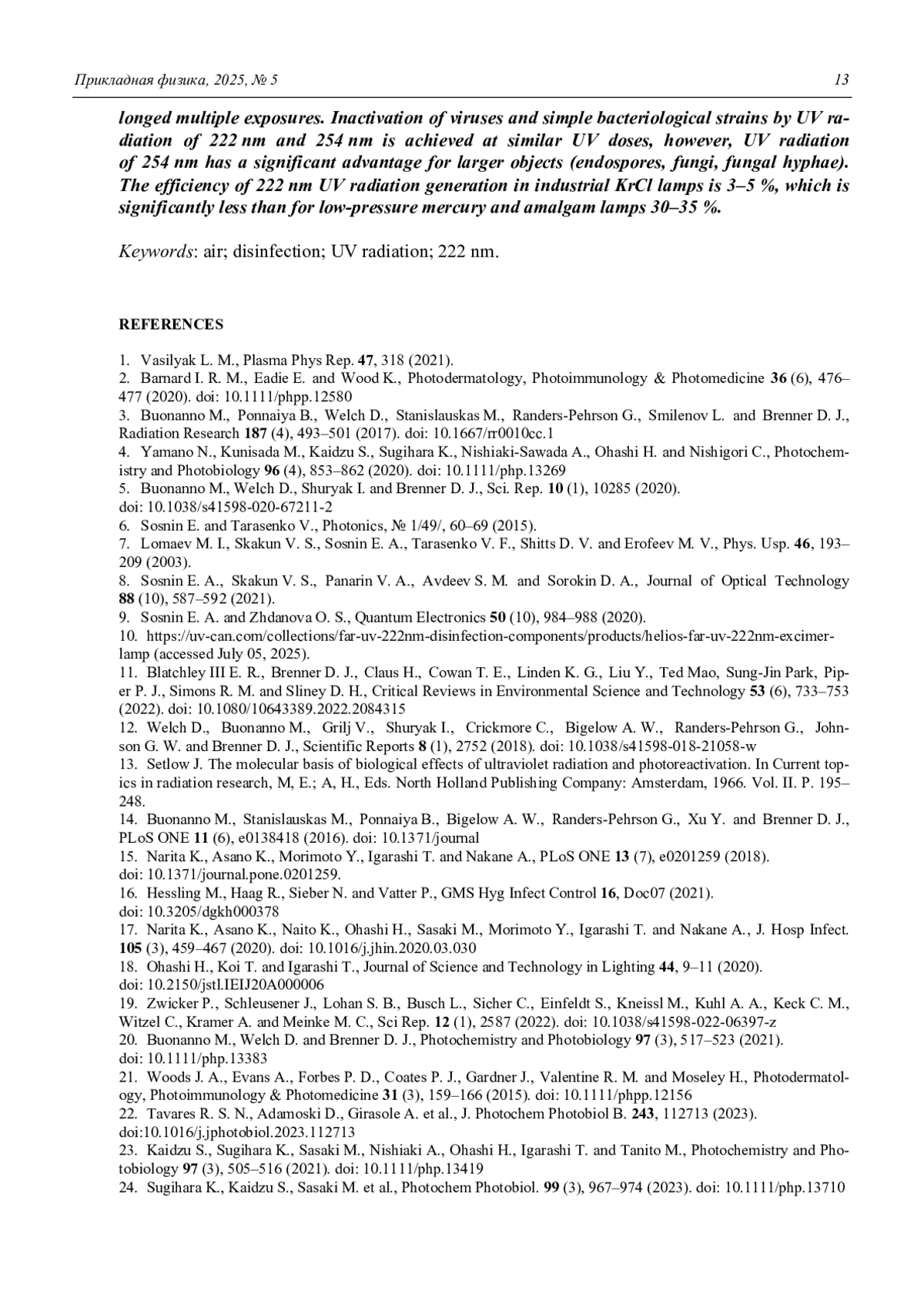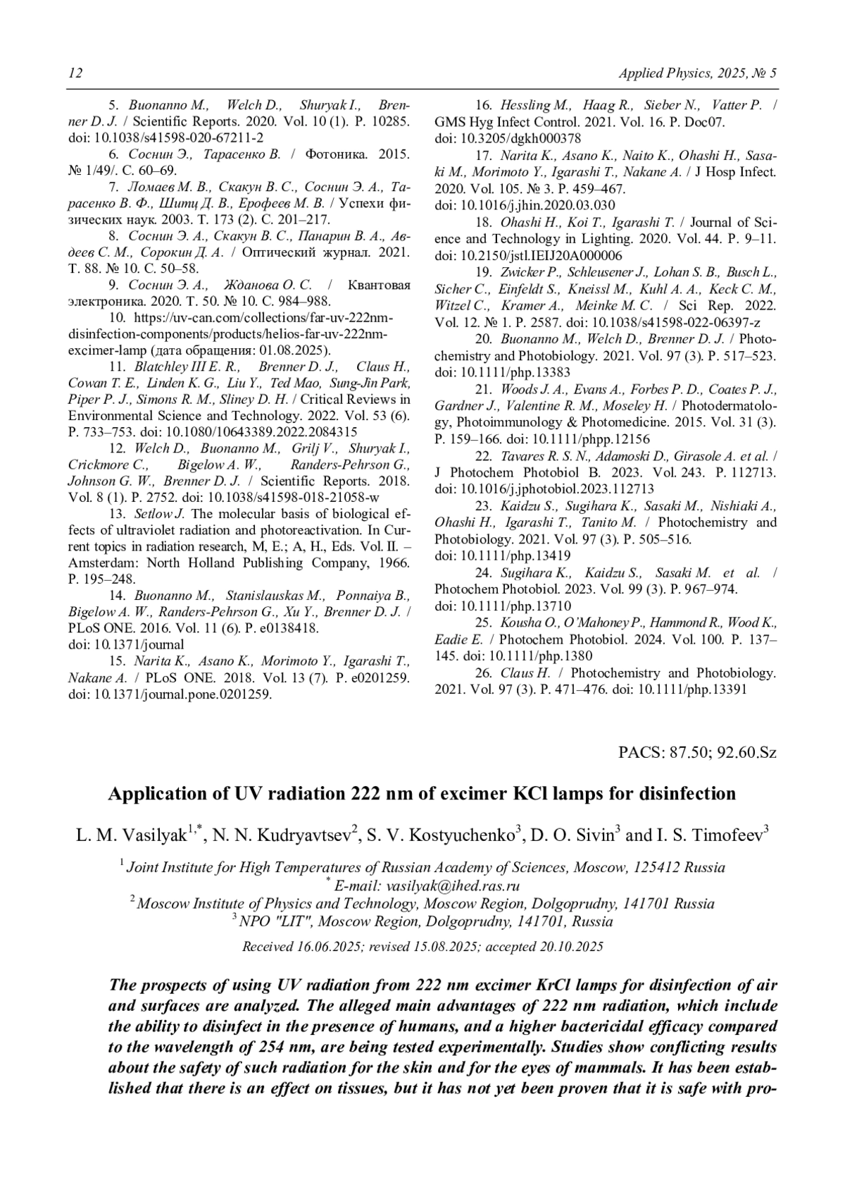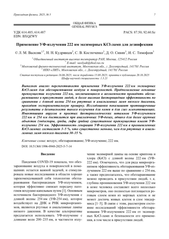 ВАСИЛЯК Л., КУДРЯВЦЕВ Н. Н., КОСТЮЧЕНКО С. В., СИВИН Д. О., ТИМОФЕЕВ И. С. ПРИМЕНЕНИЕ УФ-ИЗЛУЧЕНИЯ 222 НМ ЭКСИМЕРНЫХ KCL-ЛАМП ДЛЯ ДЕЗИНФЕКЦИИ // ПРИКЛАДНАЯ ФИЗИКА. 2025. №5