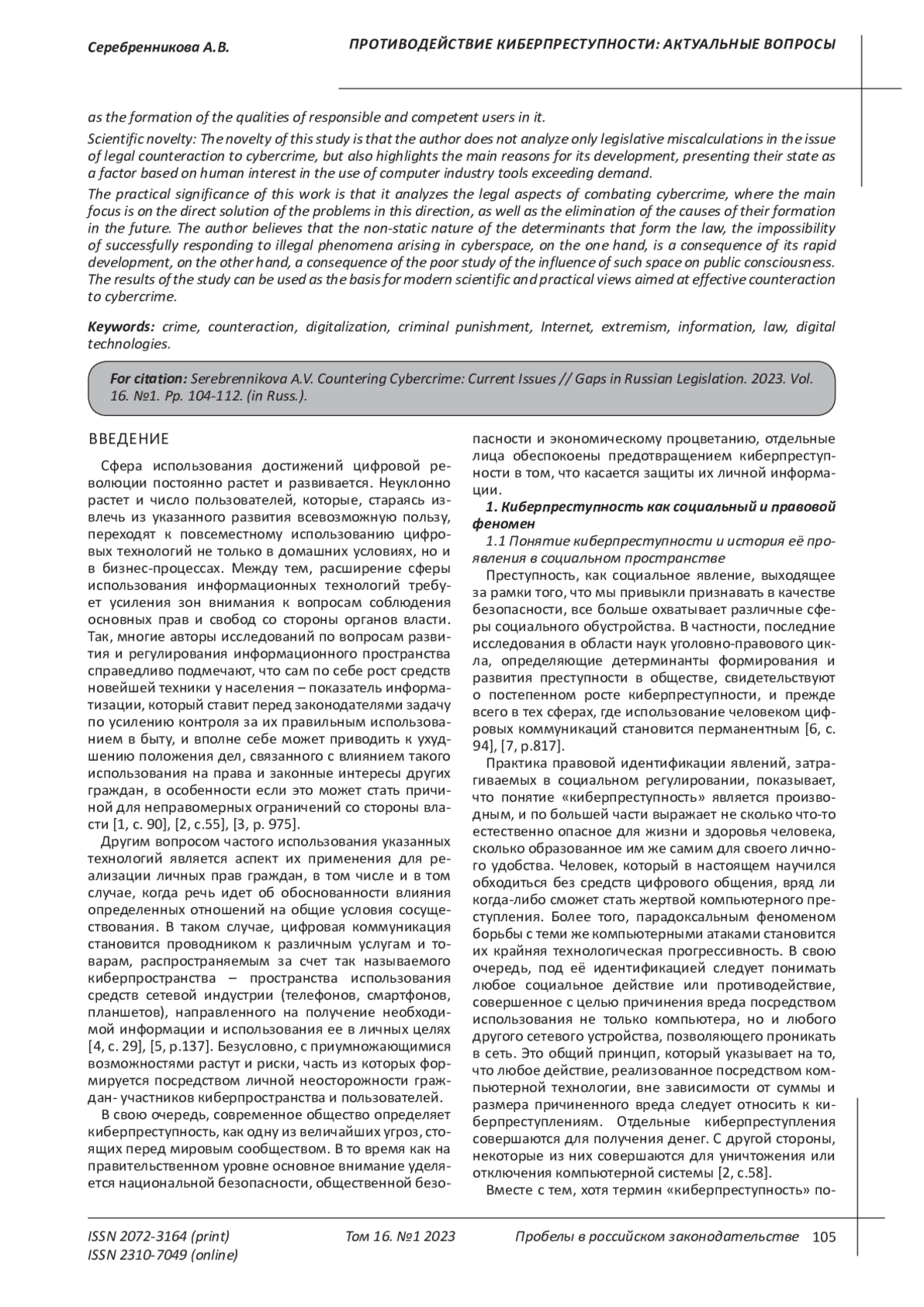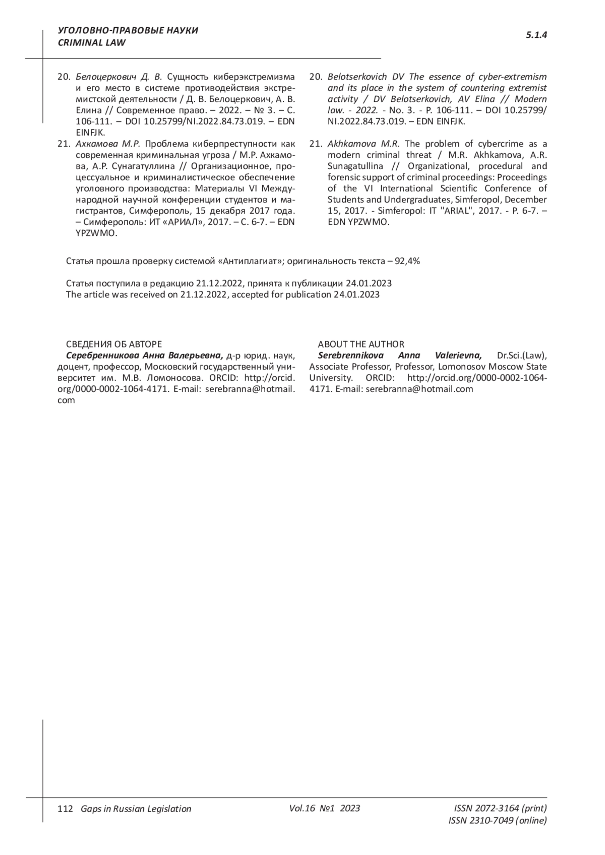 20. Белоцеркович Д. В. Сущность киберэкстремизма и его место в системе противодействия экстремистской деятельности / Д. В. Белоцеркович, А. В. Елина // Современное право. - 2022. - № 3. - С. 106-111. DOI: 10.25799/NI.2022.84.73.019 EDN: EINFJK