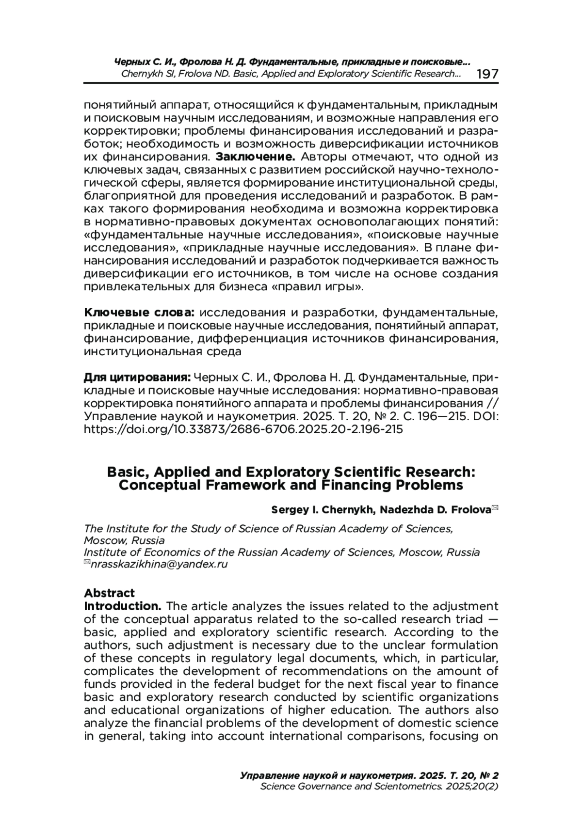 Введение. В статье анализируются вопросы, связанные с корректировкой понятийного аппарата, относящегося к так называемой исследовательской триаде - фундаментальным, прикладным и поисковым научным исследованиям. По мнению авторов, такая корректировка необходима в связи с нечеткостью формулировок данных понятий в нормативно-правовых документах, что затрудняет, в частности, разработку рекомендаций об объеме средств, предусматриваемых в федеральном бюджете на очередной финансовый год на финансирование фундаментальных и поисковых научных исследований, проводимых научными организациями и образовательными организациями высшего образования. Авторы анализируют также финансовые проблемы развития отечественной науки в целом с учетом международных сопоставлений, акцентируя внимание на фундаментальных научных исследованиях, обеспечивающих получение новых знаний и поэтому играющих, согласно Стратегии научно-технологического развития Российской Федерации, ключевую роль в подготовке научно-технологического сектора страны к новым большим вызовам.