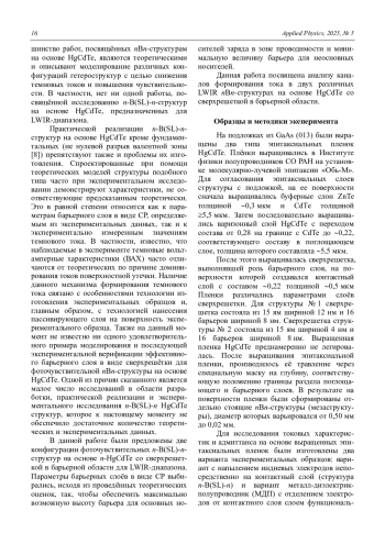 Для создания инфракрасных (ИК) фотоприёмных устройств для длинноволновой области инфракрасного (ИК) спектра (LWIR, 8–14 мкм), работающих при более высоких температурах охлаждения, чем классические фотодиоды на основе HgCdTe, перспективными являются униполярные барьерные nBn-структуры на основе HgCdTe [1].