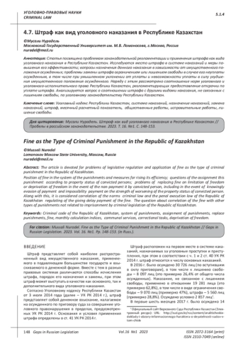 В УК РК 2014 г. предусмотрены высокие размеры штрафа, которые непосильны большинству осужденных. Согласно Закону Республики Казахстан от 2 декабря 2021 года № 77-VII ЗРК «О республиканском бюджете на 2022 – 2024 годы» месячный расчетный показатель (далее – МРП) для исчисления пособий и иных социальных выплат, а также применения штрафных санкций, налогов и других платежей в соответствии с законодательством Республики Казахстан устанавливается в размере 3 063 тенге (примерно 399 российских рублей или 6,5 долларов США)3. Так, в ст. 41 «Штраф» УК РК 2014 г. за преступления устанавливается штраф в пределах от 200 (612 600 тенге, примерно 79 870 российских рублей или 1 301 доллар США) до 10 000 МРП (30 630 000 тенге, примерно, 3 993 480 российских рублей или 65 087 долларов США) либо в кратном размере.