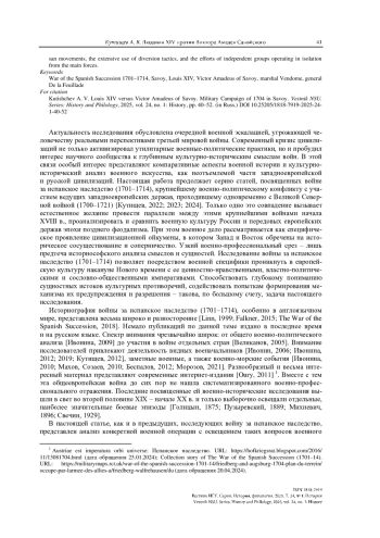 11. Кутищев А. В. Покорение Пьемонта. Война за испанское наследство 1701-1714 гг. // Вестник РУДН. Серия: Всеобщая история. 2023. Т. 15, № 2. С. 182-195.