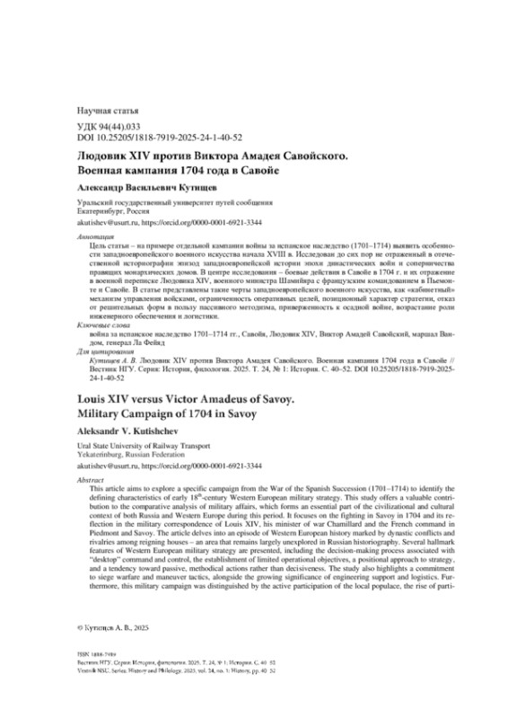 Цель статьи – на примере отдельной кампании войны за испанское наследство (1701–1714) выявить особенности западноевропейского военного искусства начала XVIII в. Исследован до сих пор не отраженный в отечественной историографии эпизод западноевропейской истории эпохи династических войн и соперничества правящих монархических домов. В центре исследования – боевые действия в Савойе в 1704 г. и их отражение в военной переписке Людовика XIV, военного министра Шамийяра с французским командованием в Пьемонте и Савойе. В статье представлены такие черты западноевропейского военного искусства, как «кабинетный» механизм управления войсками, ограниченность оперативных целей, позиционный характер стратегии, отказ от решительных форм в пользу пассивного методизма, приверженность к осадной войне, возрастание роли инженерного обеспечения и логистики.