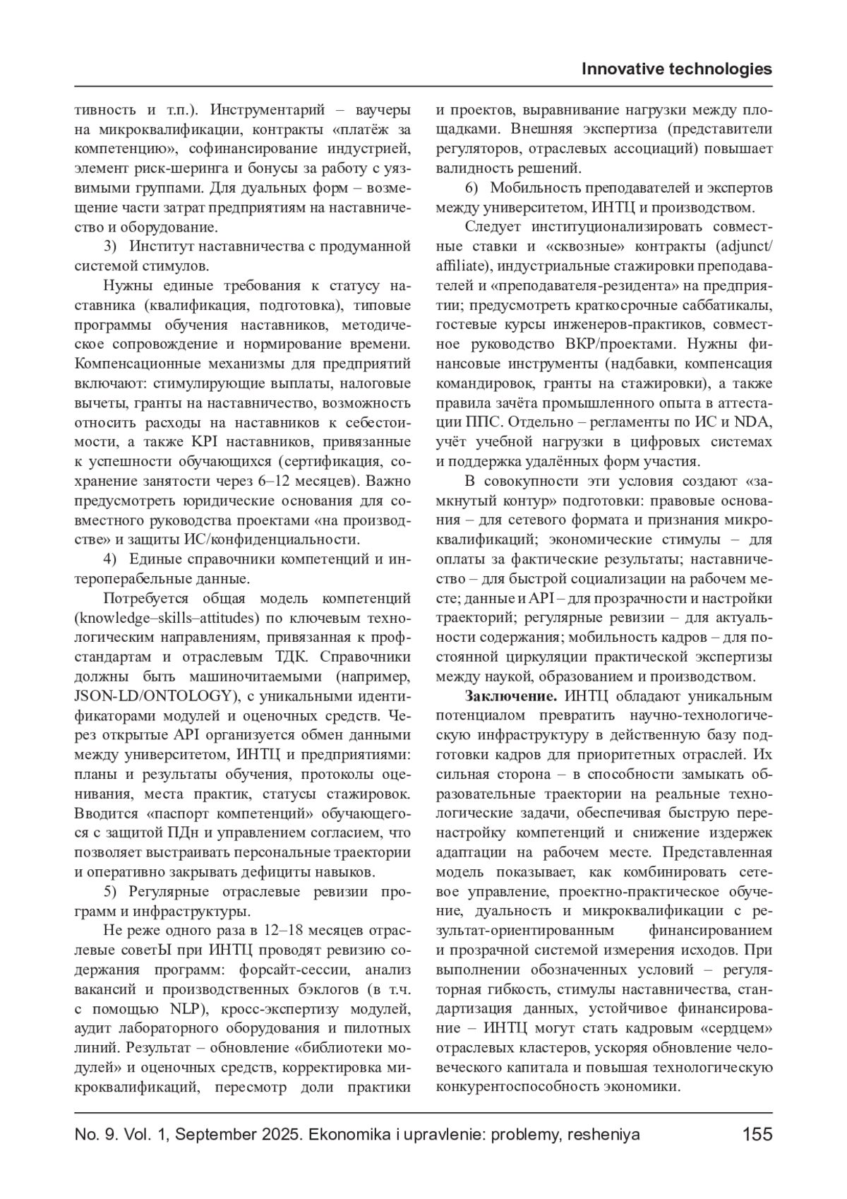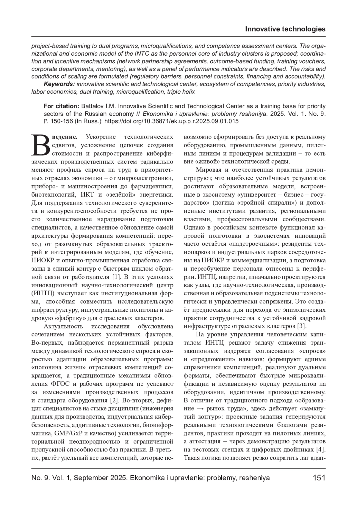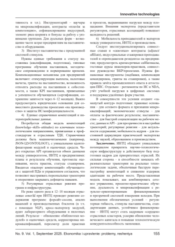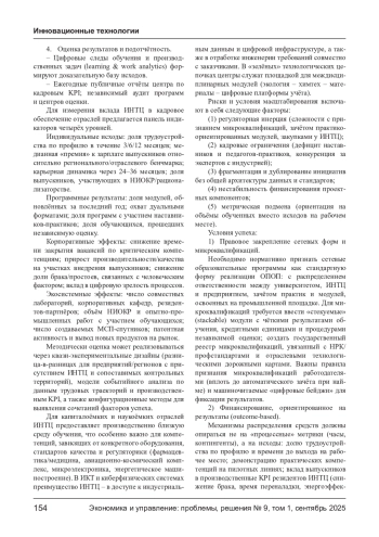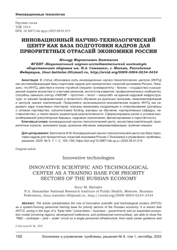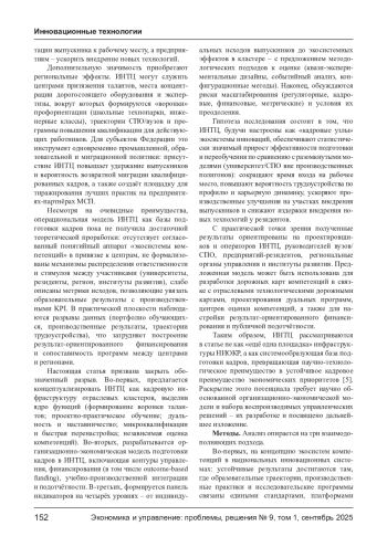 В статье обоснована роль инновационных научно-технологических центров (ИНТЦ) как системообразующей базы подготовки кадров для приоритетных отраслей экономики России. Показано, что ИНТЦ, действуя в логике «тройной спирали» (университеты - бизнес - государство) и расширенной модели экосистем (с участием регионов, институтов развития, профессиональных сообществ), способны замыкать контур «НИОКР - прототип - пилот - масштаб» на единой кадровой инфраструктуре: от ранней профориентации и проектного обучения до дуальных программ, микроквалификаций и центров оценки компетенций. Предложена организационно-экономическая модель ИНТЦ как кадрового ядра отраслевых кластеров; описаны механизмы координации и стимулирования (договоры о сетевом партнёрстве, outcome-based funding, ваучеры на обучение, корпоративные кафедры, наставничество), а также панель индикаторов результативности. Сформулированы риски и условия масштабирования (регуляторные барьеры, кадровые ограничения, финансирование и подотчётность).