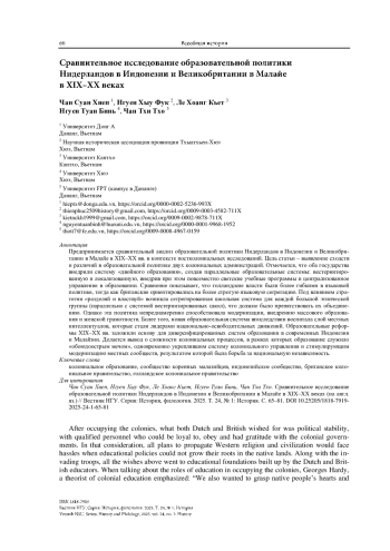 Предпринимается сравнительный анализ образовательной политики Нидерландов в Индонезии и Великобритании в Малайе в XIX–XX вв. в контексте постколониальных исследований. Цель статьи – выявление сходств и различий в образовательной политике двух колониальных администраций. Отмечается, что оба государства внедрили систему «двойного образования», создав параллельные образовательные системы: вестернизированную и локализованную, внедрив при этом повсеместно светские учебные программы и централизованное управление в образовании. Сравнение показывает, что голландские власти были более гибкими в языковой политике, тогда как британские ориентировались на более строгую языковую сегрегацию. Под влиянием стратегии «разделяй и властвуй» возникла сегрегированная школьная система для каждой большой этнической группы (параллельно с системой вестернизированных школ), что должно было препятствовать их объединению. Однако эта политика непреднамеренно способствовала модернизации, внедрению массового образования и женской грамотности. Более того, новая образовательная система впоследствии воспитала слой местных интеллектуалов, которые стали лидерами национально-освободительных движений. Образовательные реформы XIX–XX вв. заложили основу для диверсифицированных систем образования в современных Индонезии и Малайзии. Делается вывод о сложности колониальных процессов, в рамках которых образование служило «обоюдоострым мечом», одновременно укреплявшим систему колониального управления и стимулирующим модернизацию местных сообществ, результатом которой была борьба за национальную независимость.