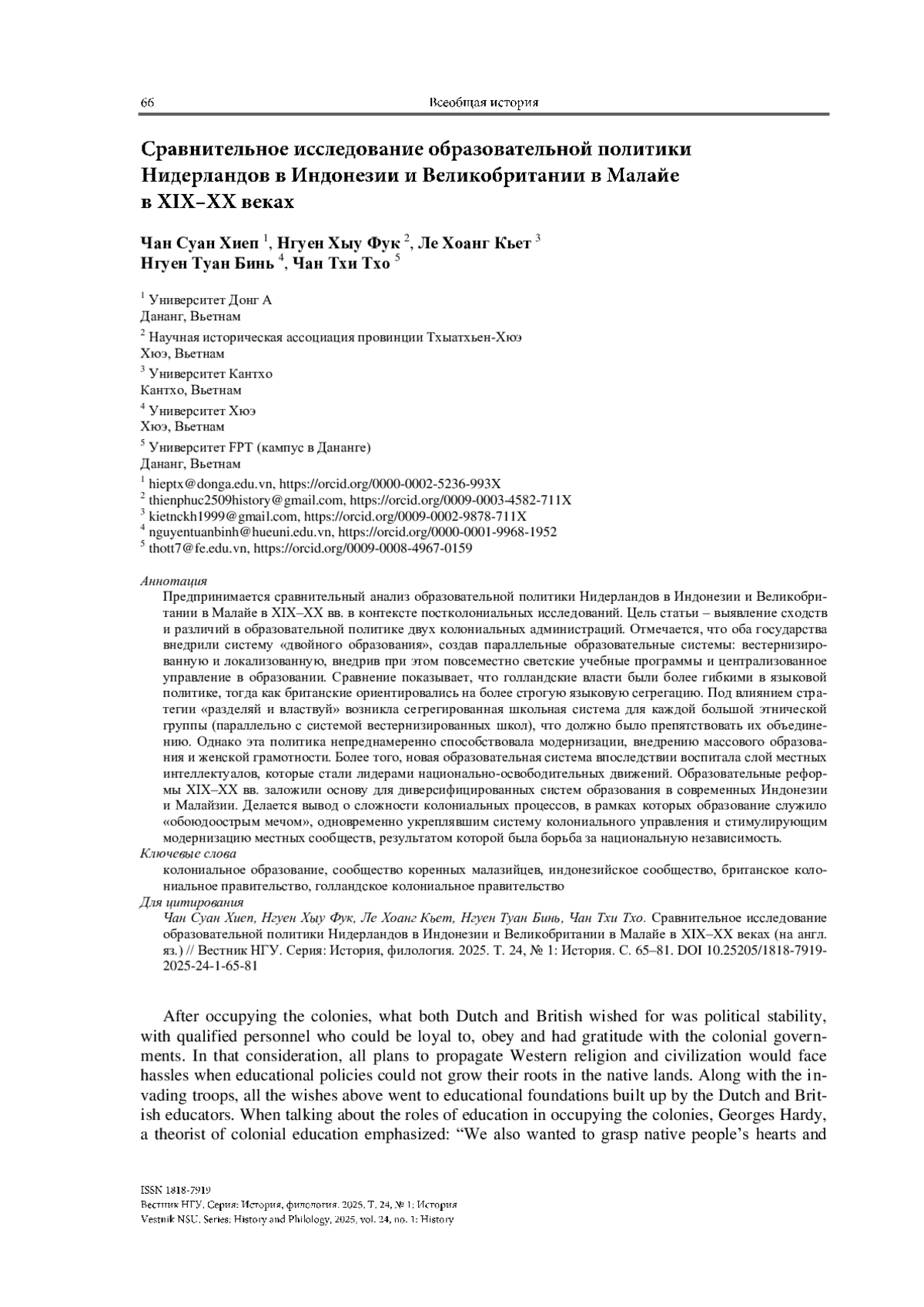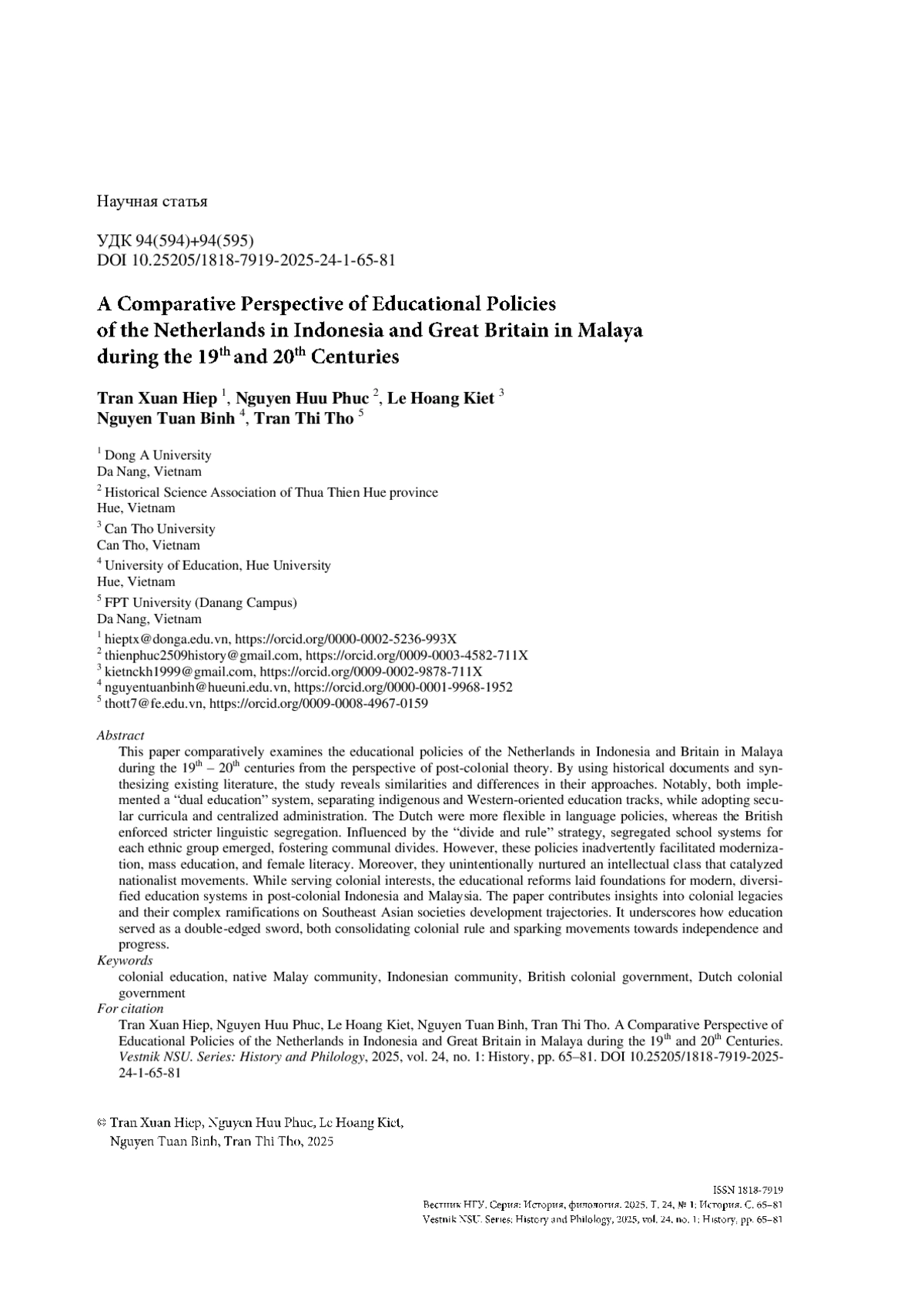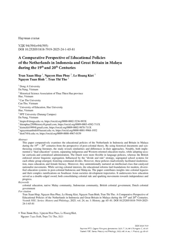 This paper comparatively examines the educational policies of the Netherlands in Indonesia and Britain in Malaya during the 19th – 20th centuries from the perspective of post-colonial theory. By using historical documents and synthesizing existing literature, the study reveals similarities and differences in their approaches. Notably, both implemented a “dual education” system, separating indigenous and Western-oriented education tracks, while adopting secular curricula and centralized administration. The Dutch were more flexible in language policies, whereas the British enforced stricter linguistic segregation. Influenced by the “divide and rule” strategy, segregated school systems for each ethnic group emerged, fostering communal divides. However, these policies inadvertently facilitated modernization, mass education, and female literacy. Moreover, they unintentionally nurtured an intellectual class that catalyzed nationalist movements. While serving colonial interests, the educational reforms laid foundations for modern, diversified education systems in post-colonial Indonesia and Malaysia. The paper contributes insights into colonial legacies and their complex ramifications on Southeast Asian societies development trajectories. It underscores how education served as a double-edged sword, both consolidating colonial rule and sparking movements towards independence and progress.