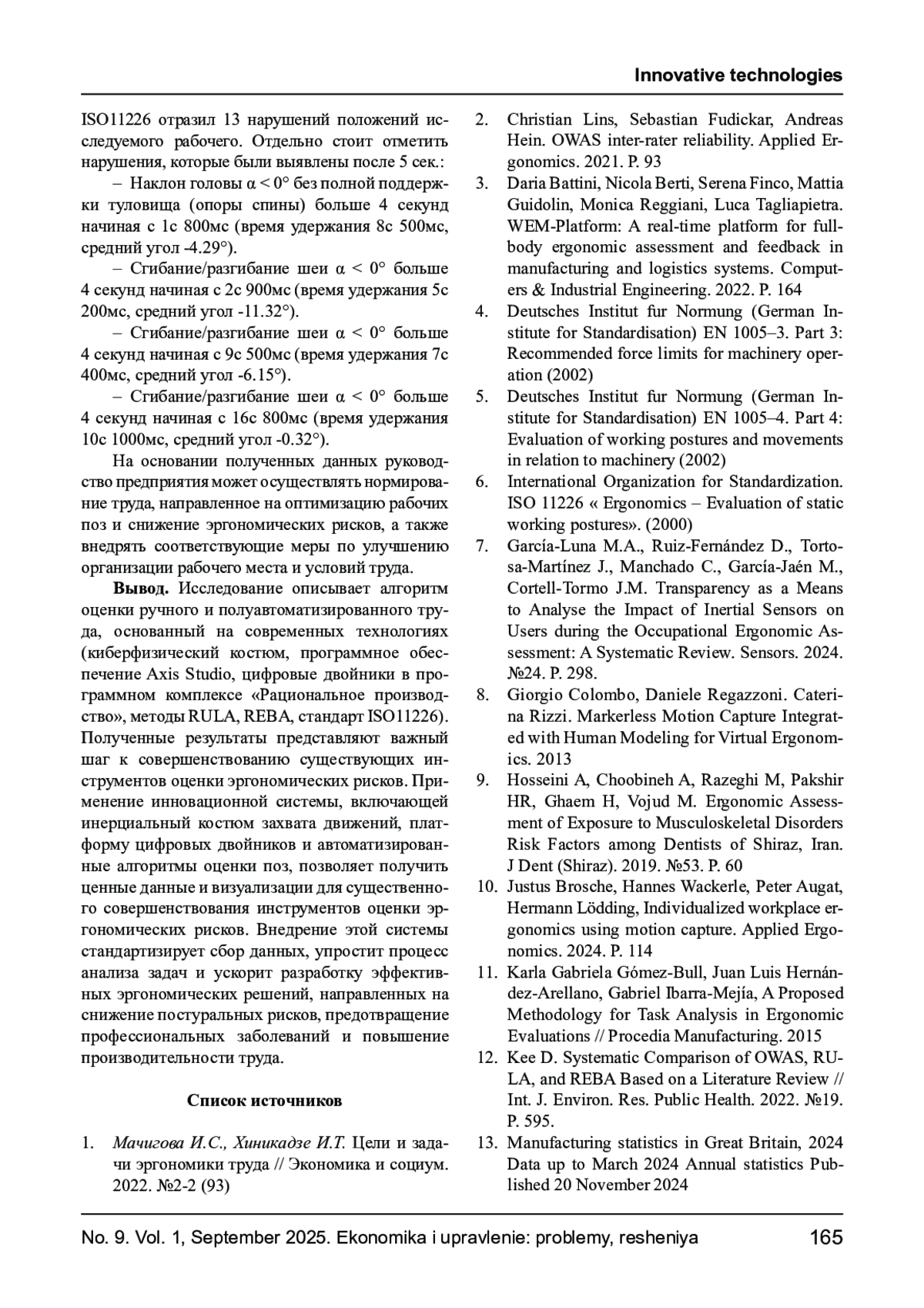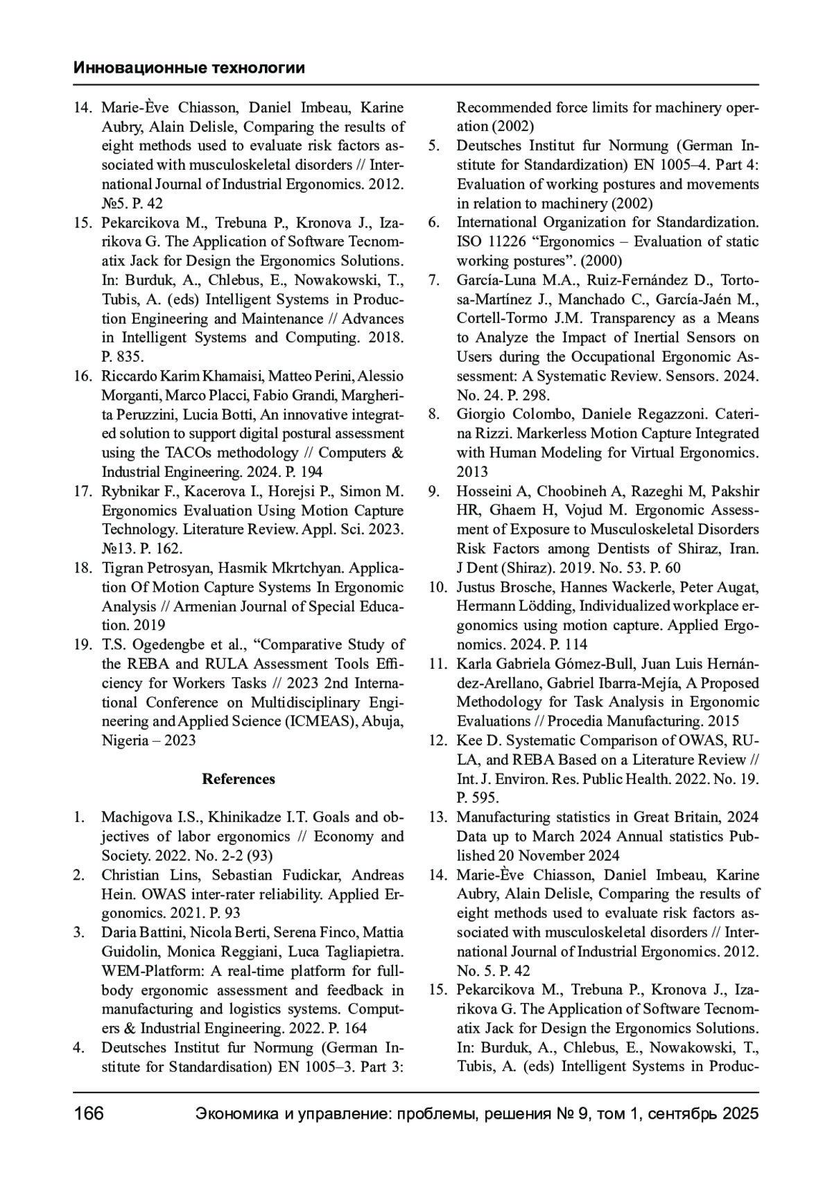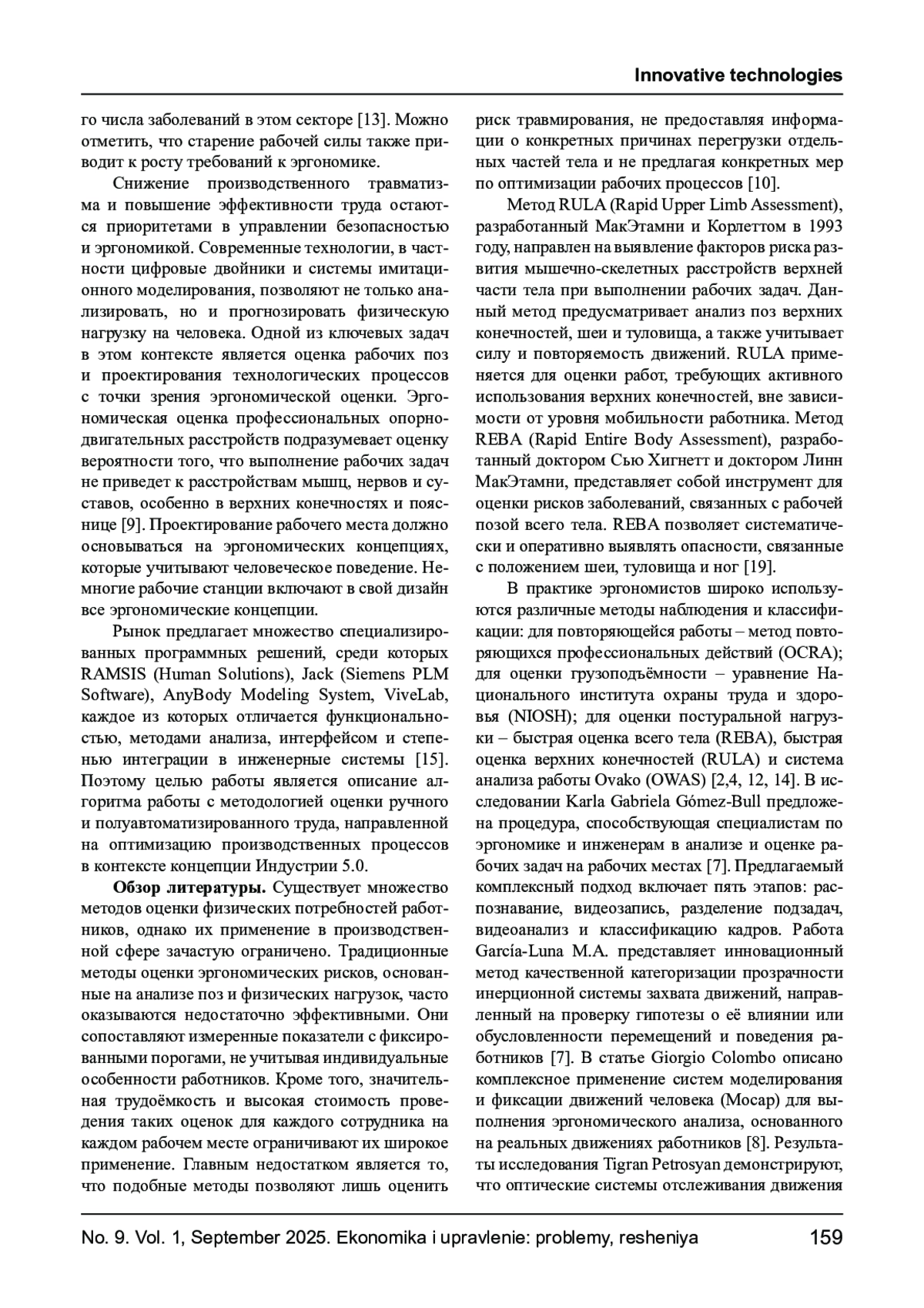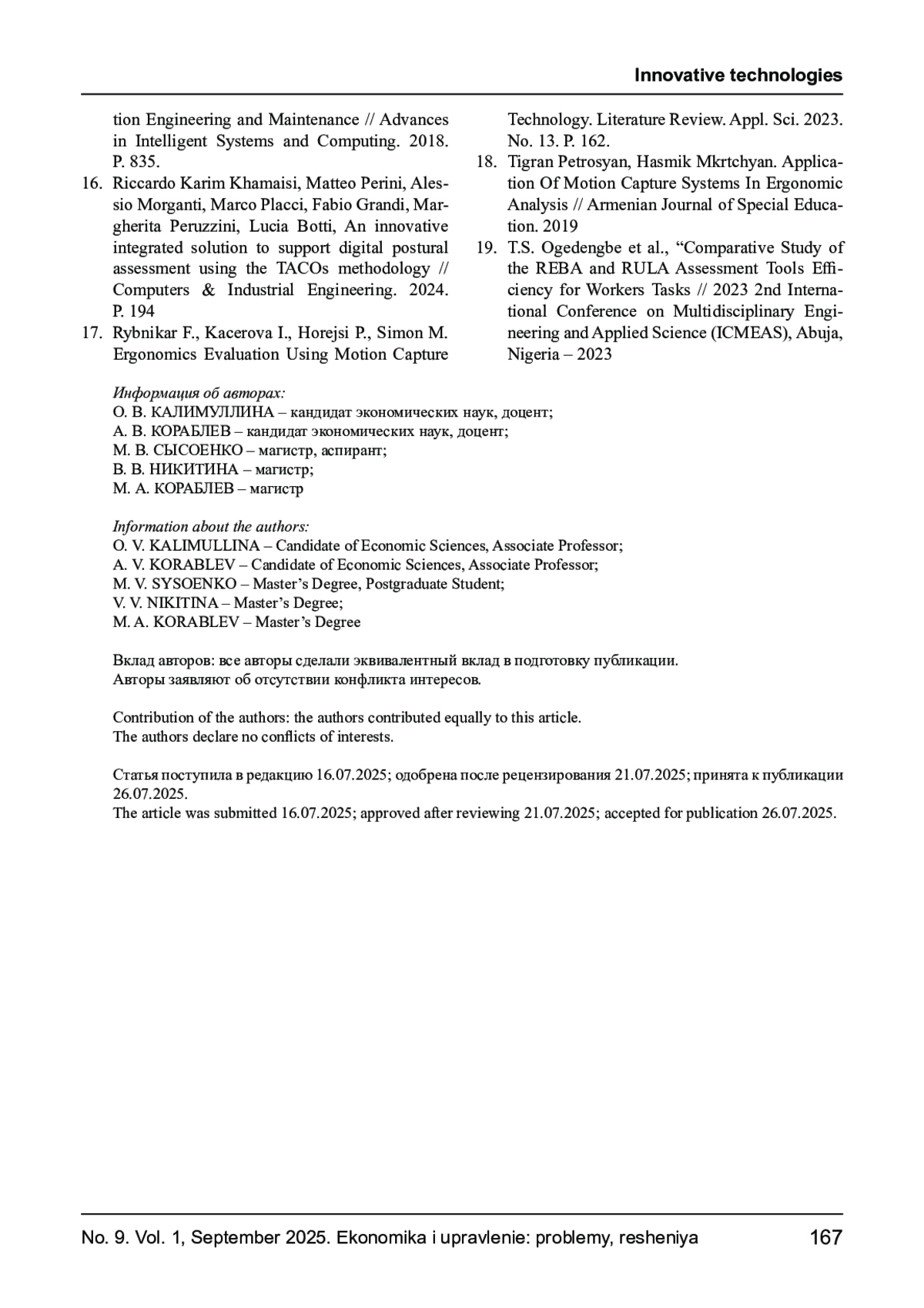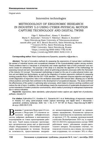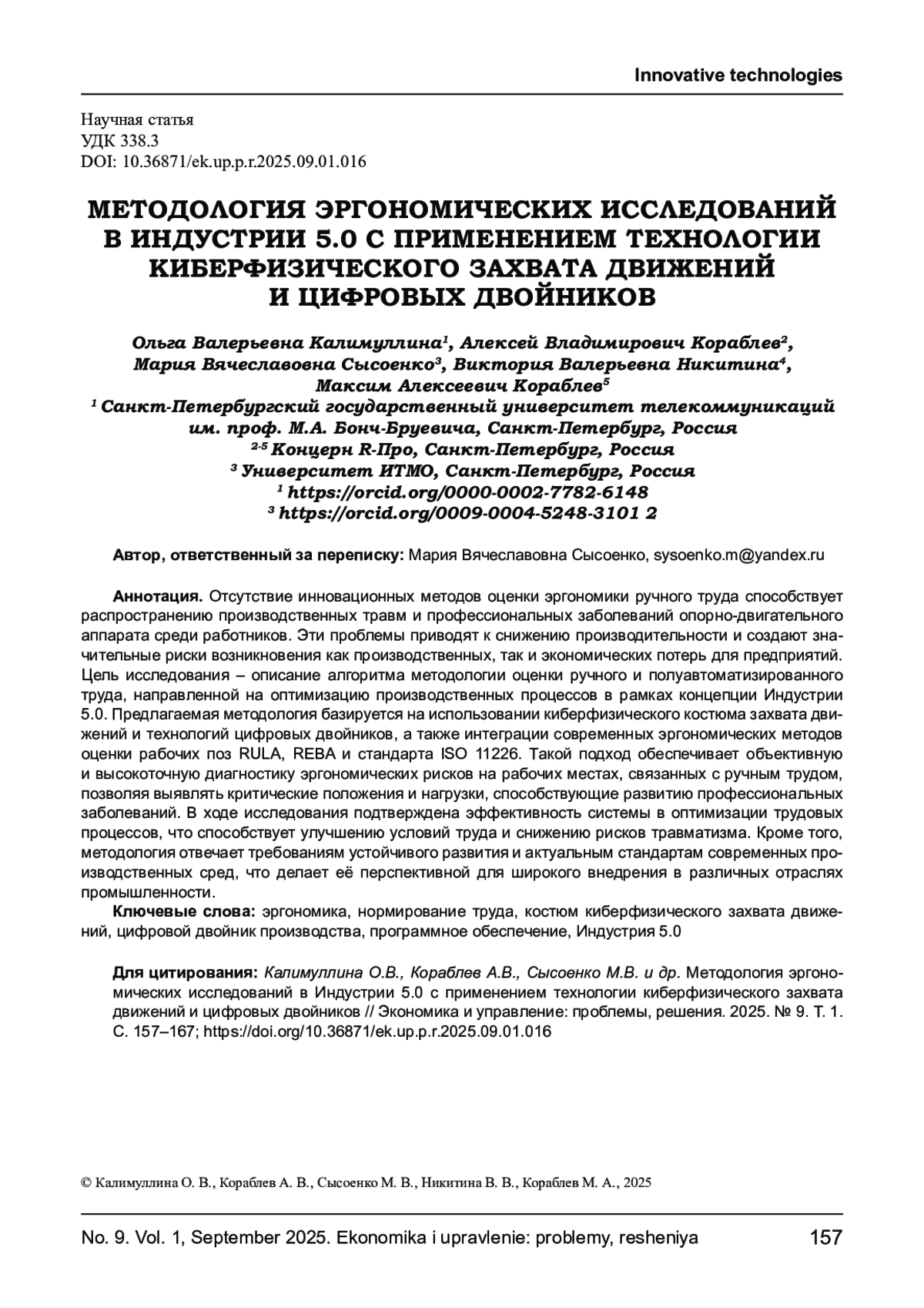 КАЛИМУЛЛИНА О. В., КОРАБЛЕВ А. В., СЫСОЕНКО М. В., НИКИТИНА В. В., КОРАБЛЕВ М. А. МЕТОДОЛОГИЯ ЭРГОНОМИЧЕСКИХ ИССЛЕДОВАНИЙ В ИНДУСТРИИ 5.0 С ПРИМЕНЕНИЕМ ТЕХНОЛОГИИ КИБЕРФИЗИЧЕСКОГО ЗАХВАТА ДВИЖЕНИЙ И ЦИФРОВЫХ ДВОЙНИКОВ // ЭКОНОМИКА И УПРАВЛЕНИЕ: ПРОБЛЕМЫ, РЕШЕНИЯ. 2025. ТОМ 1 № 9