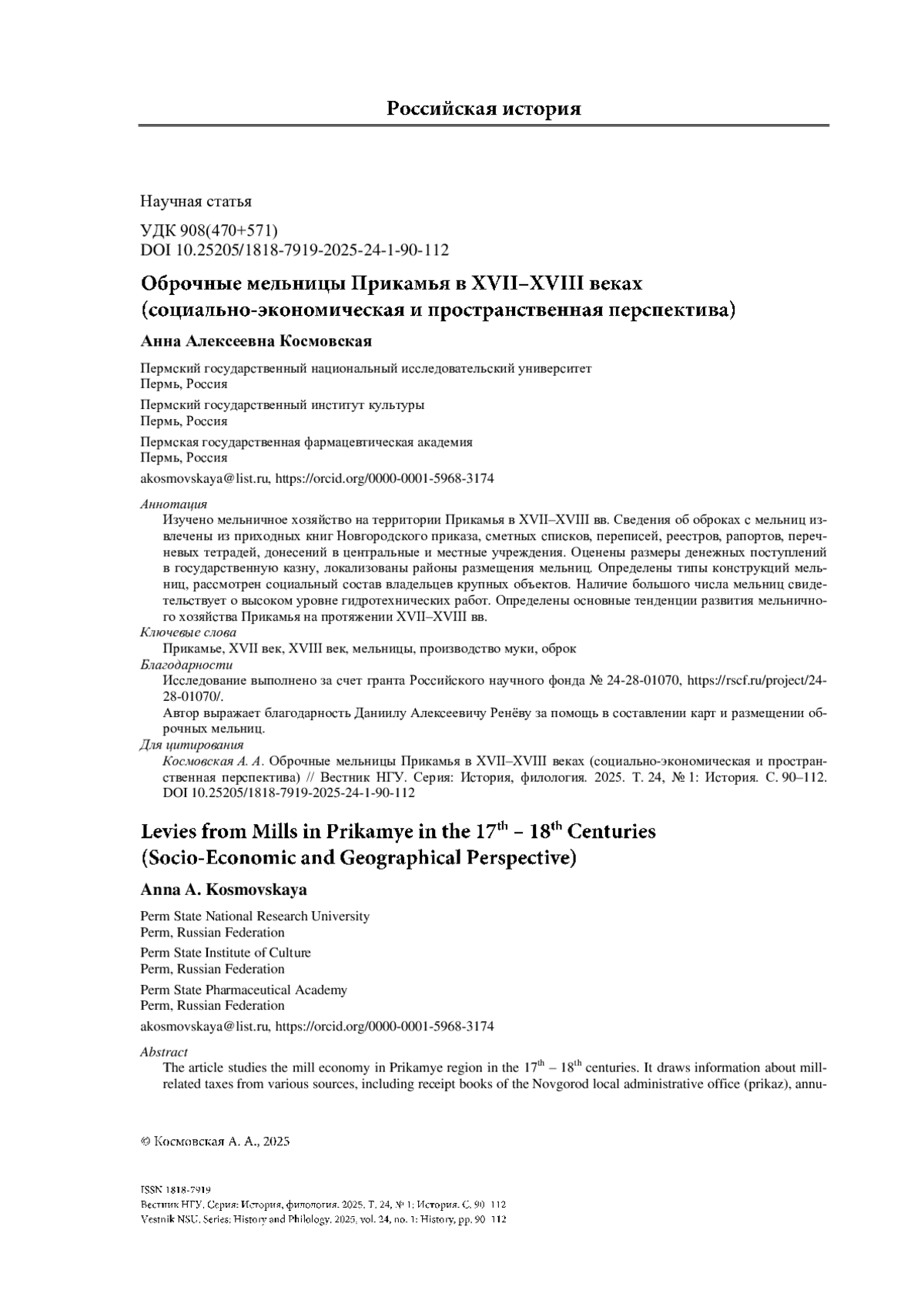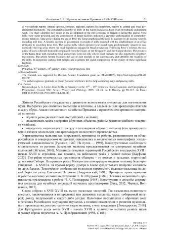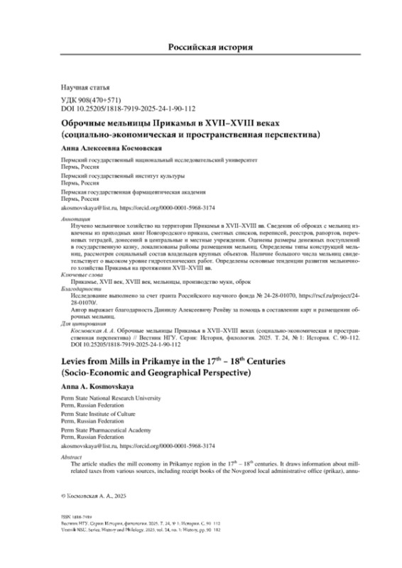 Изучено мельничное хозяйство на территории Прикамья в XVII–XVIII вв. Сведения об оброках с мельниц извлечены из приходных книг Новгородского приказа, сметных списков, переписей, реестров, рапортов, перечневых тетрадей, донесений в центральные и местные учреждения. Оценены размеры денежных поступлений в государственную казну, локализованы районы размещения мельниц. Определены типы конструкций мельниц, рассмотрен социальный состав владельцев крупных объектов. Наличие большого числа мельниц свидетельствует о высоком уровне гидротехнических работ. Определены основные тенденции развития мельничного хозяйства Прикамья на протяжении XVII–XVIII вв.