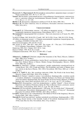 10. Муренко Д. И. Социальная активность научной молодежи новосибирского Академгородка в 1958-1970 гг.: Дис. … канд. ист. наук. Новосибирск, 2022. 314 с.