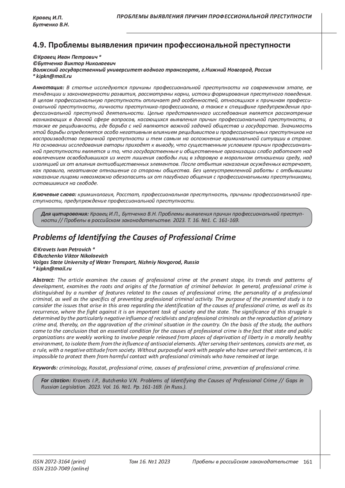 6. Кравец И.П., (2022), Проблемы специальных мер предупреждения профессиональной преступности. Пробелы в российском законодательстве, 2: 134-143. EDN: PZUKUF