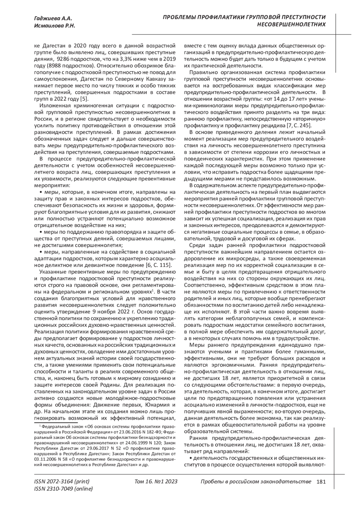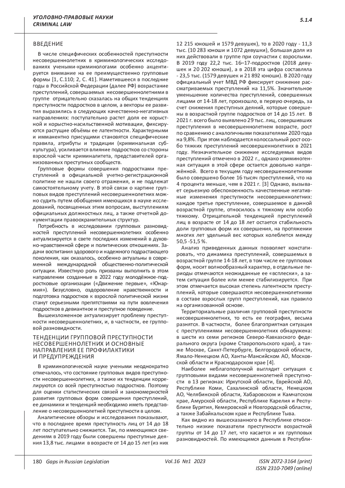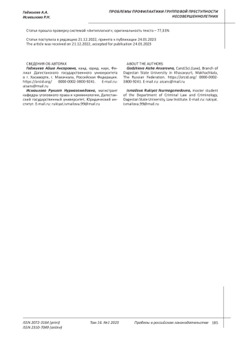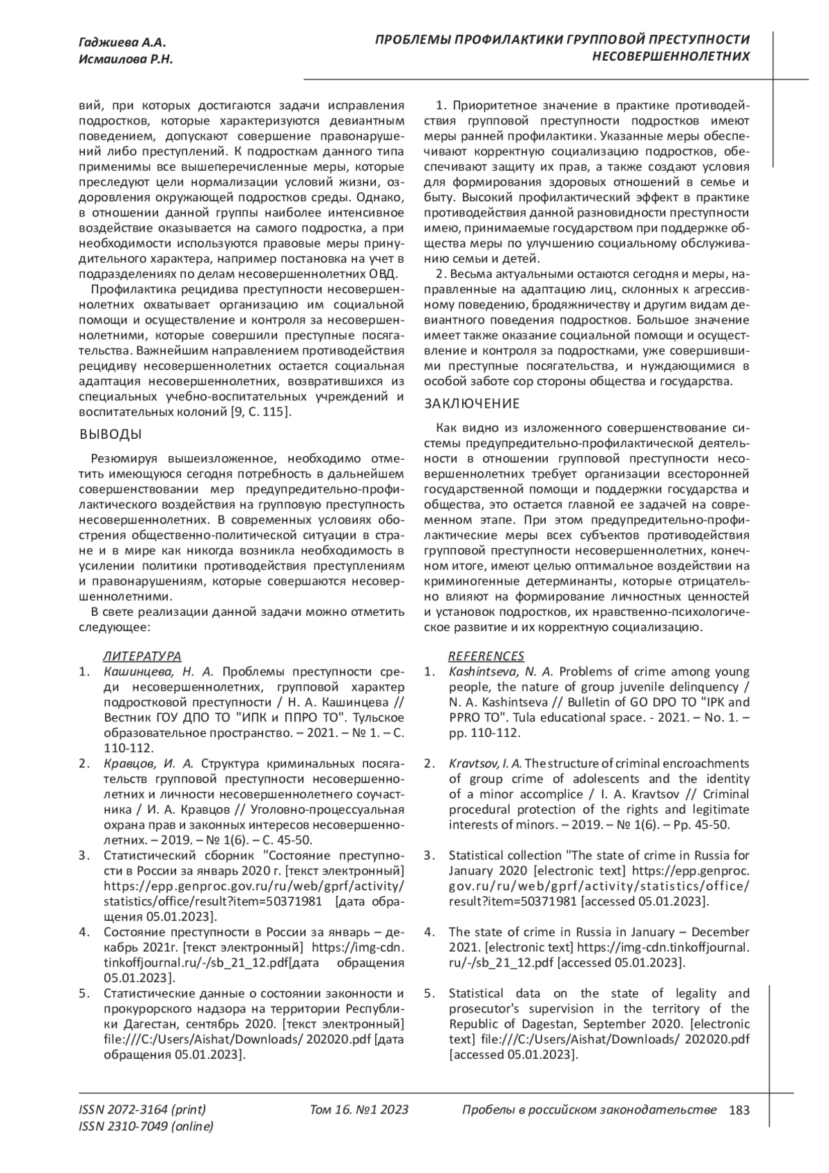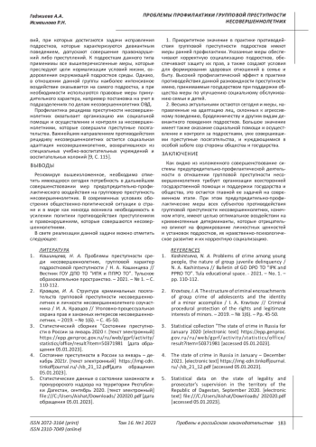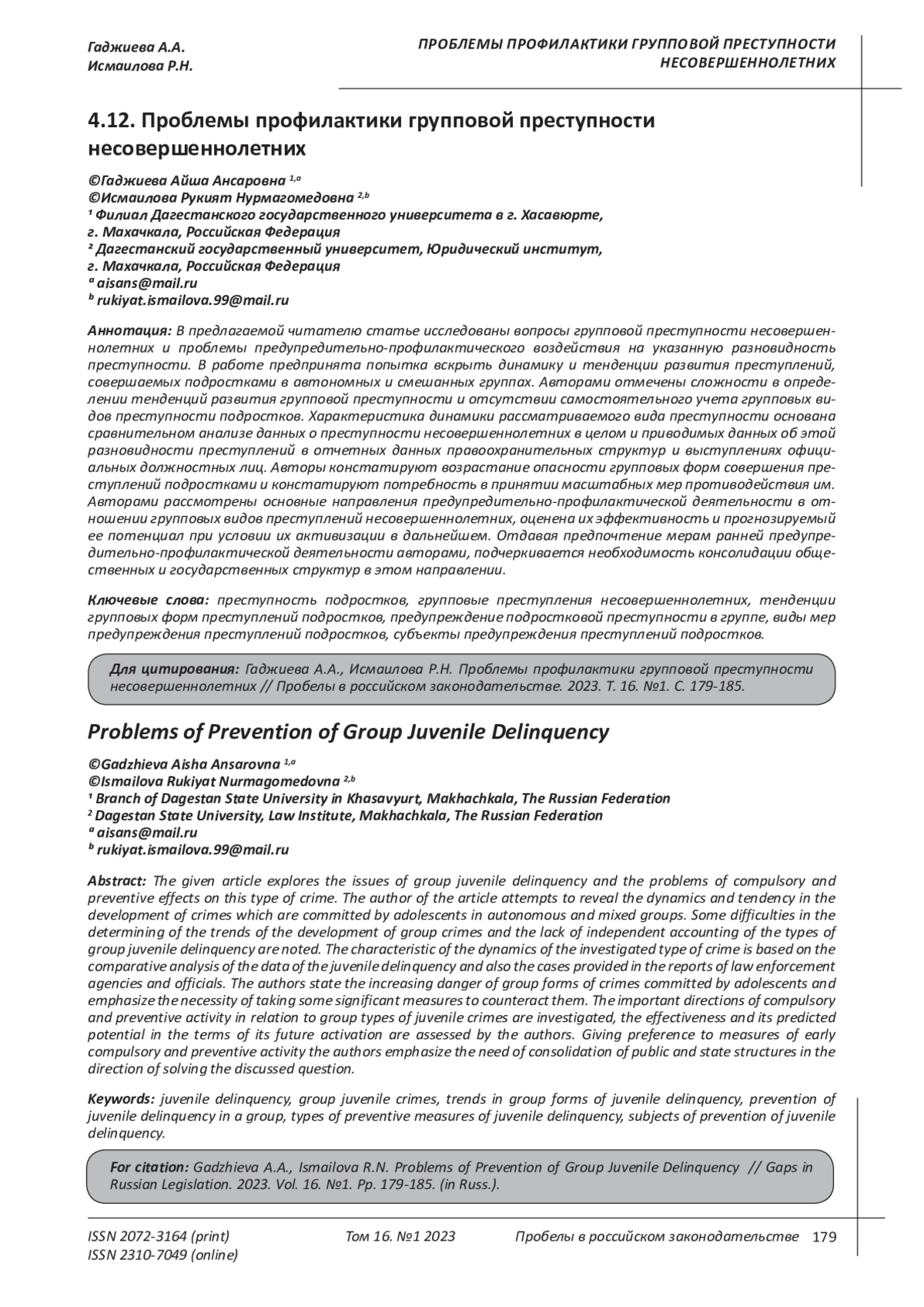 ГАДЖИЕВА А. А., ИСМАИЛОВА Р. Н. ПРОБЛЕМЫ ПРОФИЛАКТИКИ ГРУППОВОЙ ПРЕСТУПНОСТИ НЕСОВЕРШЕННОЛЕТНИХ // ПРОБЕЛЫ В РОССИЙСКОМ ЗАКОНОДАТЕЛЬСТВЕ. 2023. Т. 16 № 1