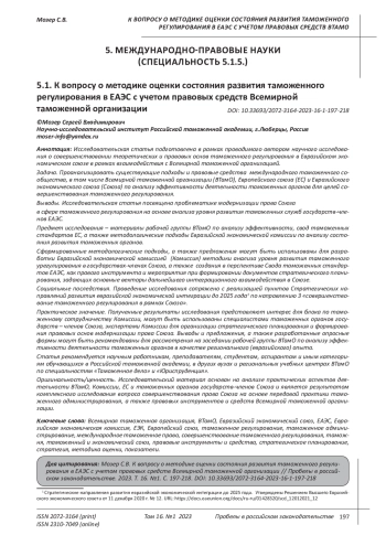 Статья: К ВОПРОСУ О МЕТОДИКЕ ОЦЕНКИ СОСТОЯНИЯ РАЗВИТИЯ ТАМОЖЕННОГО РЕГУЛИРОВАНИЯ В ЕАЭС С УЧЕТОМ ПРАВОВЫХ СРЕДСТВ ВСЕМИРНОЙ ТАМОЖЕННОЙ ОРГАНИЗАЦИИ (2023)