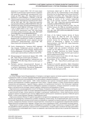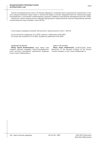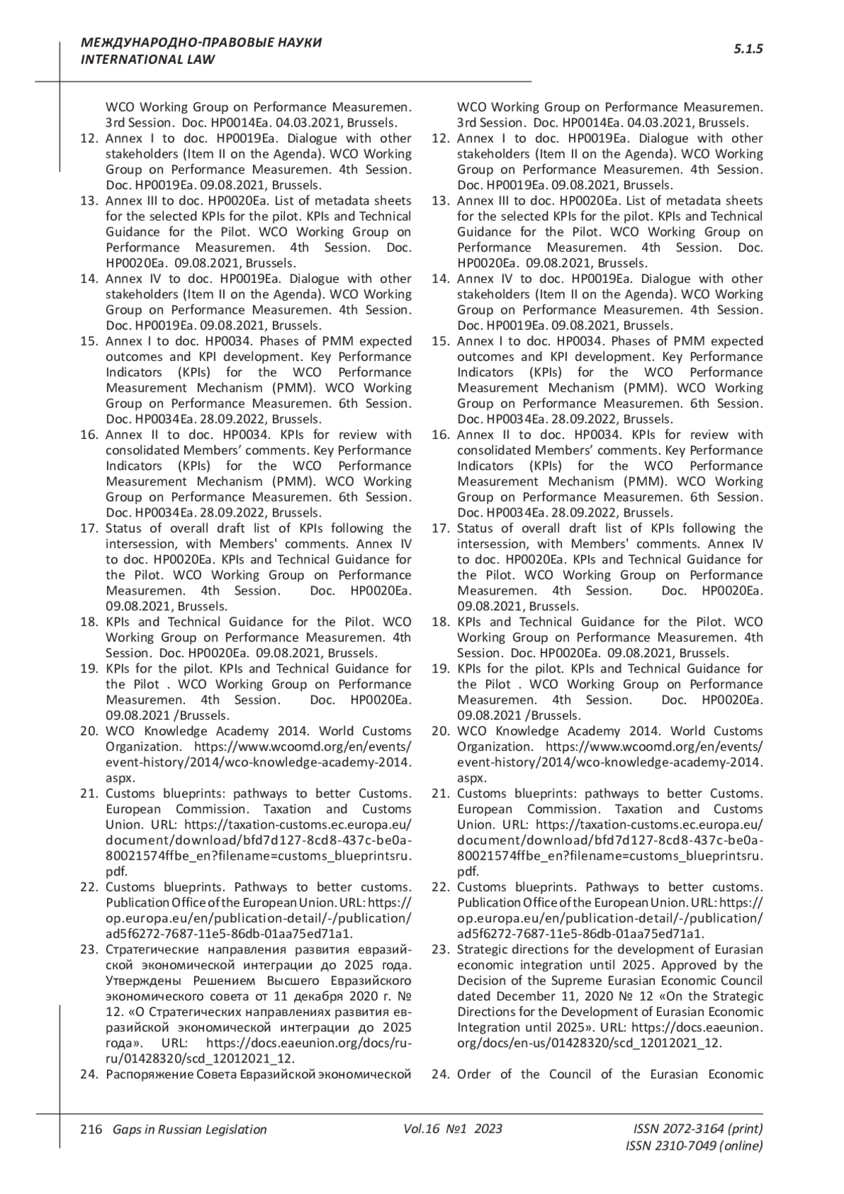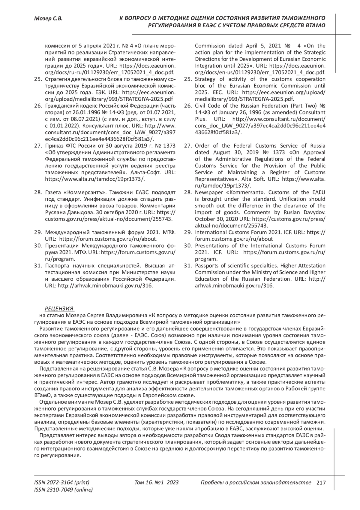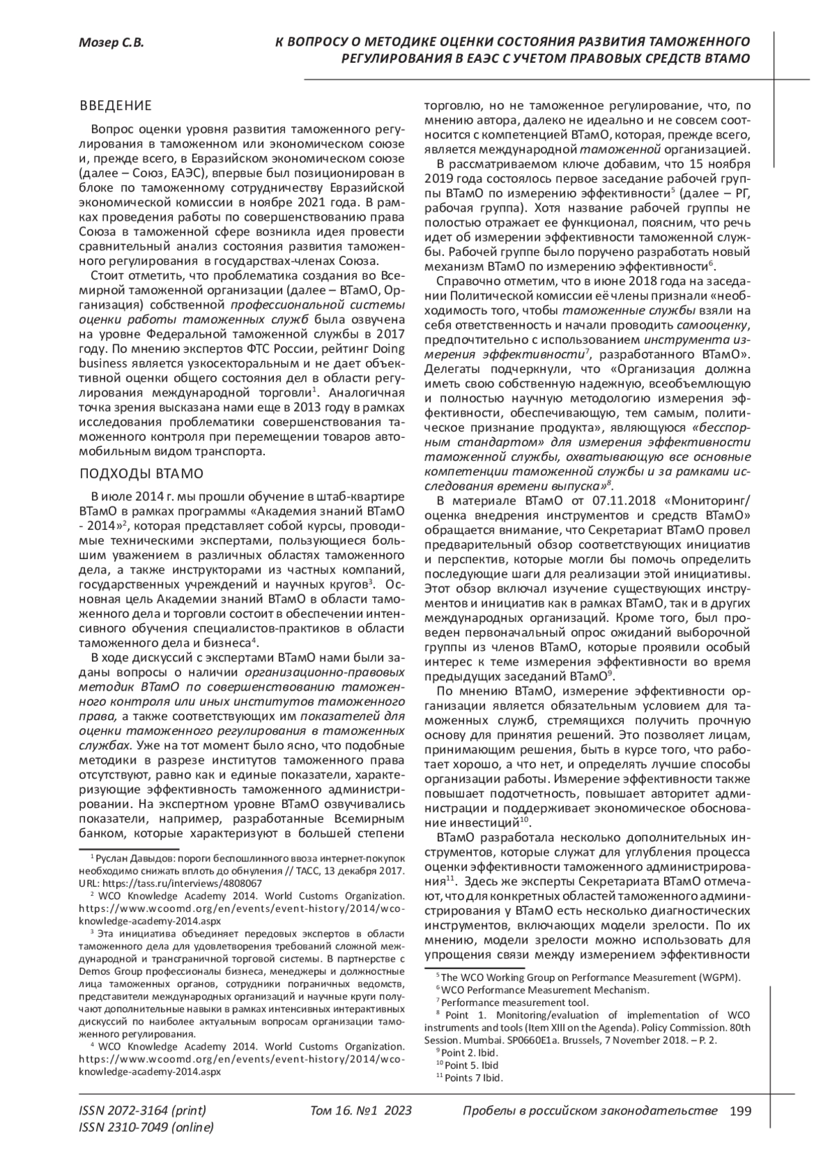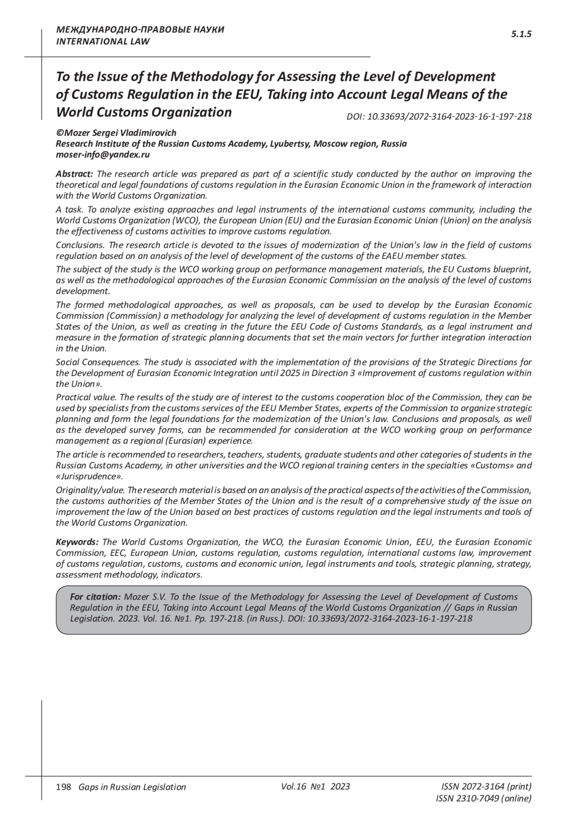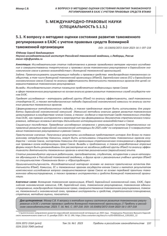 МОЗЕР С. В. К ВОПРОСУ О МЕТОДИКЕ ОЦЕНКИ СОСТОЯНИЯ РАЗВИТИЯ ТАМОЖЕННОГО РЕГУЛИРОВАНИЯ В ЕАЭС С УЧЕТОМ ПРАВОВЫХ СРЕДСТВ ВСЕМИРНОЙ ТАМОЖЕННОЙ ОРГАНИЗАЦИИ // ПРОБЕЛЫ В РОССИЙСКОМ ЗАКОНОДАТЕЛЬСТВЕ. 2023. Т. 16 № 1