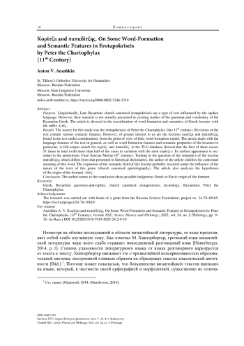 Статья посвящена рассмотрению словообразования и семантики греческих лексем с формантом -(ι)τζ-, обнаруженных в тексте памятника византийской канонико-правовой письменности конца XI в., автором которого считается Петр Хартофилакс. В статье рассматриваются языковые особенности текста в целом, а также словообразовательные особенности и семантические свойства лексем κορίτζα и παπαδίτζης в частности. Обращаясь к вопросу семантики лексемы παπαδίτζης, отличающейся от представленной в исторических словарях, автор статьи уточняет контекстуальное значение этого слова. Расширение семантического поля этой лексемы, вероятно, произошло под влиянием характера текстов этого жанра (канонико-правовая эпистолография). Также в статье проводится анализ гипотез происхождения форманта -(ί)τζ-. Автор обращает внимание на возможность исконно греческого или славянского происхождения этого суффикса.
