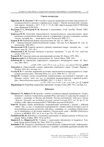 1. Ефремова И. Н., Белкова Т. М. Способы и средства выражения категории определенности / неопределенности в русском и французском языках // Научно-методический электронный журнал «Концепт». 2017. Т. 28. С. 27-30. URL: http://e-koncept.ru/2017/770678.htm (дата обращения 20.08.2022).
