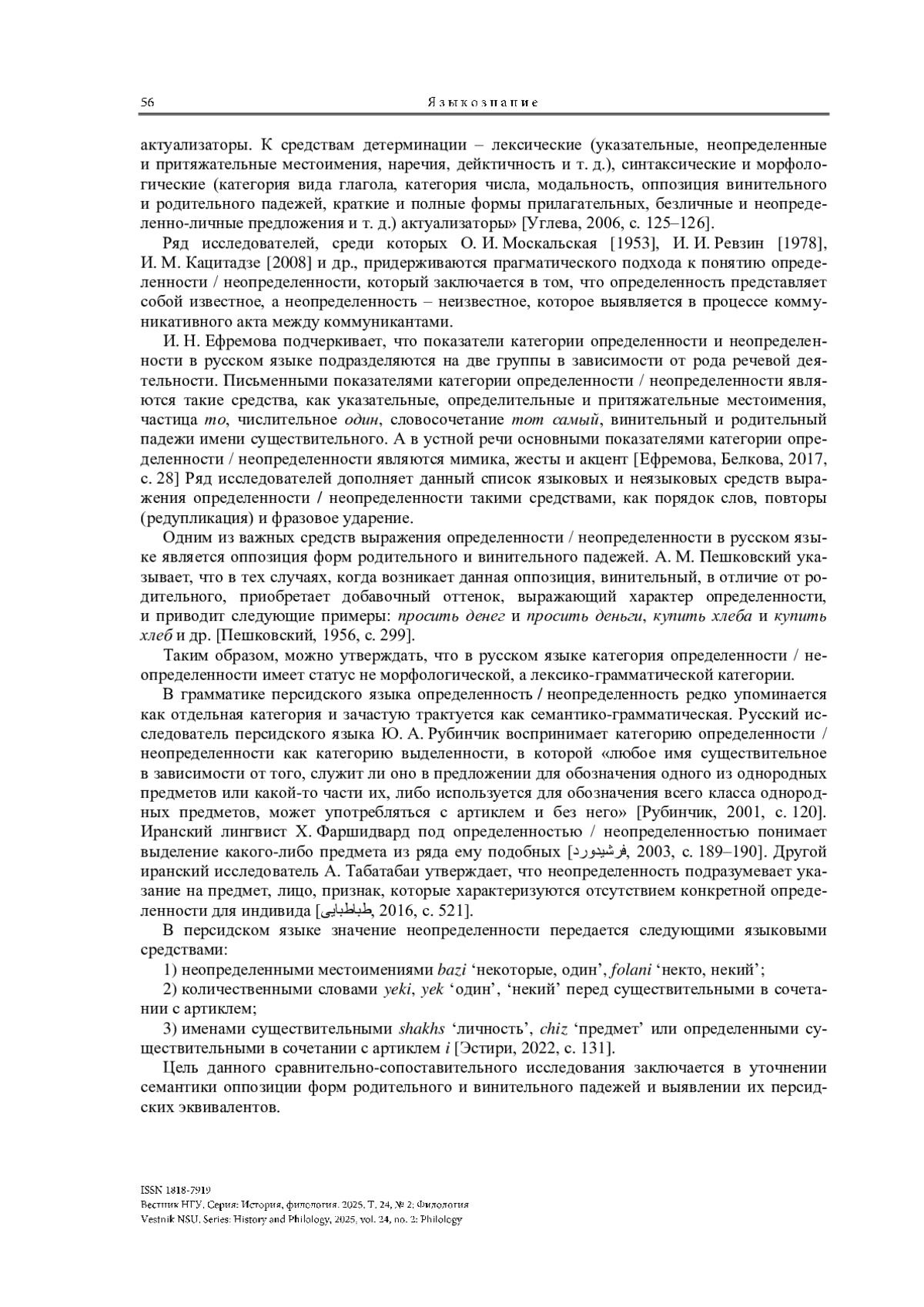 Цель данного исследования заключается в сопоставлении способов выражения категории определенности / неопределенности в русском и персидском языках. Материалом для исследования послужили примеры, отобранные методом сплошной выборки из различного рода исследовательских работ, учебников русского языка для студентов-иностранцев, личной картотеки ошибок, собранной авторами при контроле учебного процесса и практики перевода студентов-русистов высших учебных заведений Ирана. Исследование построено на основе качественного анализа и сравнительно-сопоставительного метода. В результате уточнена классификация признаков, лежащих в основе оппозиции форм винительного и родительного падежей как средств выражения определенности и неопределенности в русском языке, и исчислены их корреляты в персидском языке.
