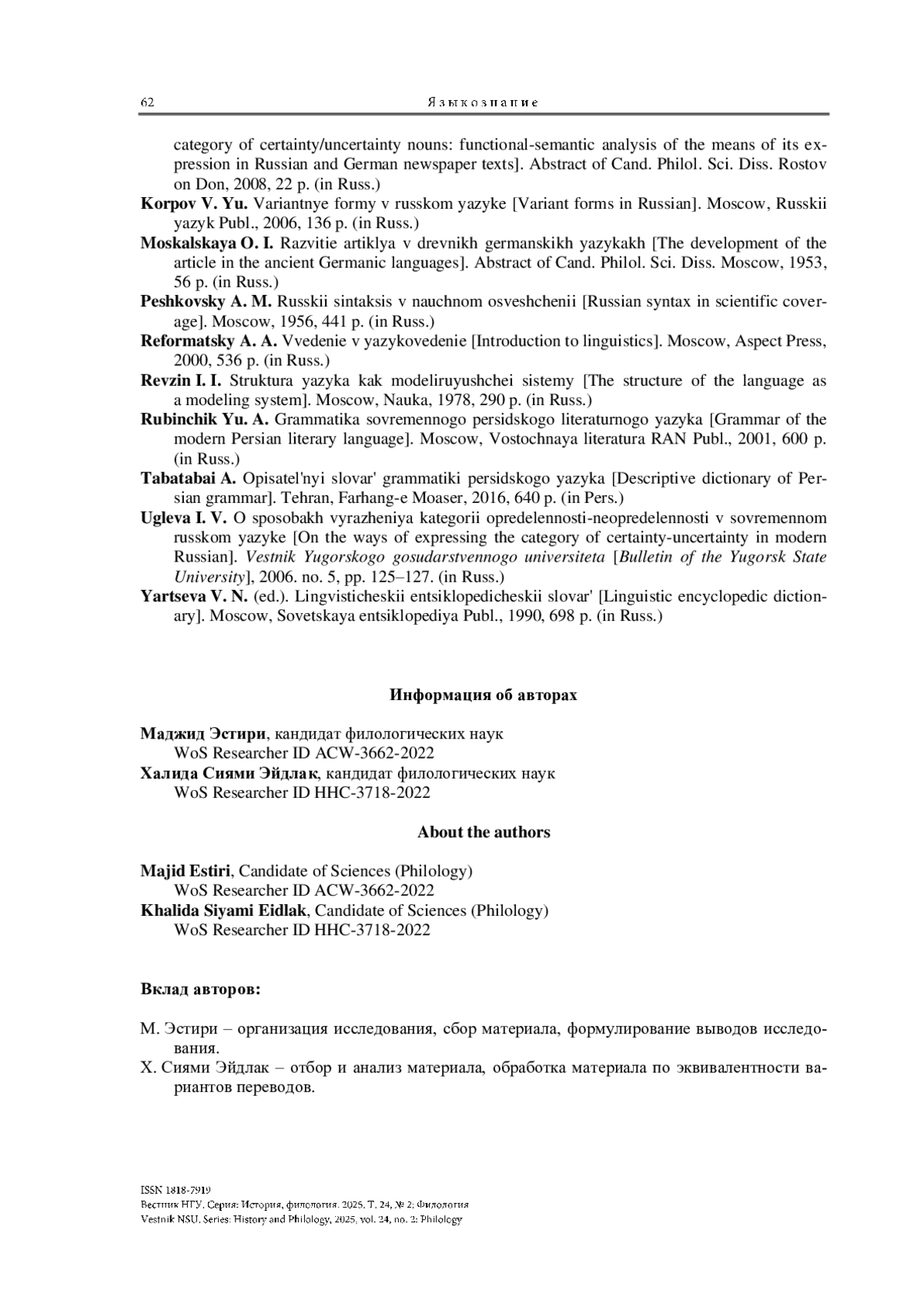 14. Эстири М. Сложные случаи употребления неопределенных местоимений и наречий с аффиксами -нибудь, -либо, -то, кое- со значением неопределенности в иранской аудитории // Филологические науки в МГИМО. 2022. Т. 8, № 4. С. 129‒139.