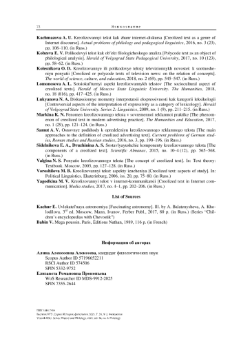 4. Ворошилова М. Б. Креолизованный текст: аспекты изучения // Политическая лингвистика. Екатеринбург, 2006. Вып. 20. С. 75-80.