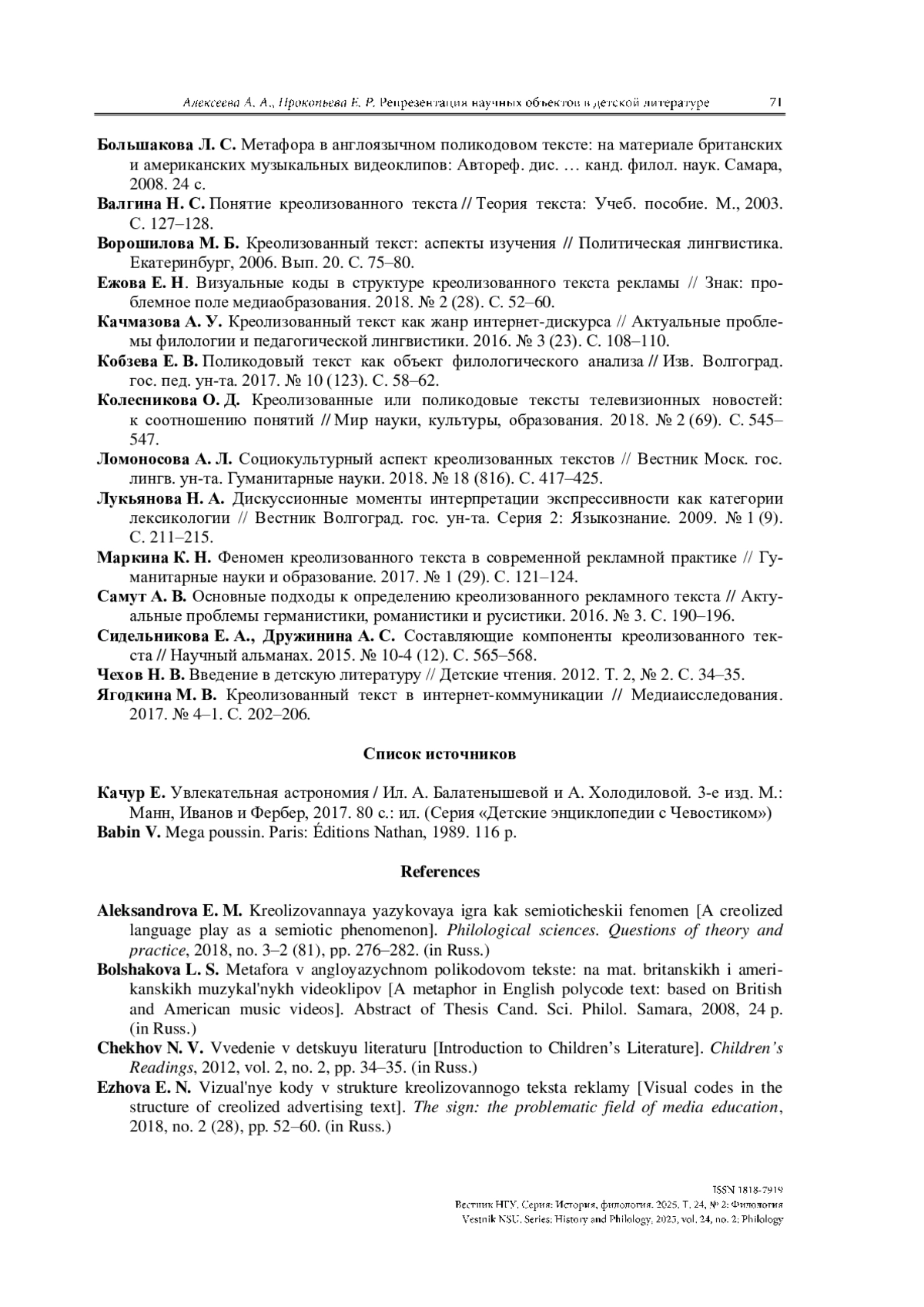 7. Кобзева Е. В. Поликодовый текст как объект филологического анализа // Изв. Волгоград. гос. пед. ун-та. 2017. № 10 (123). С. 58-62.