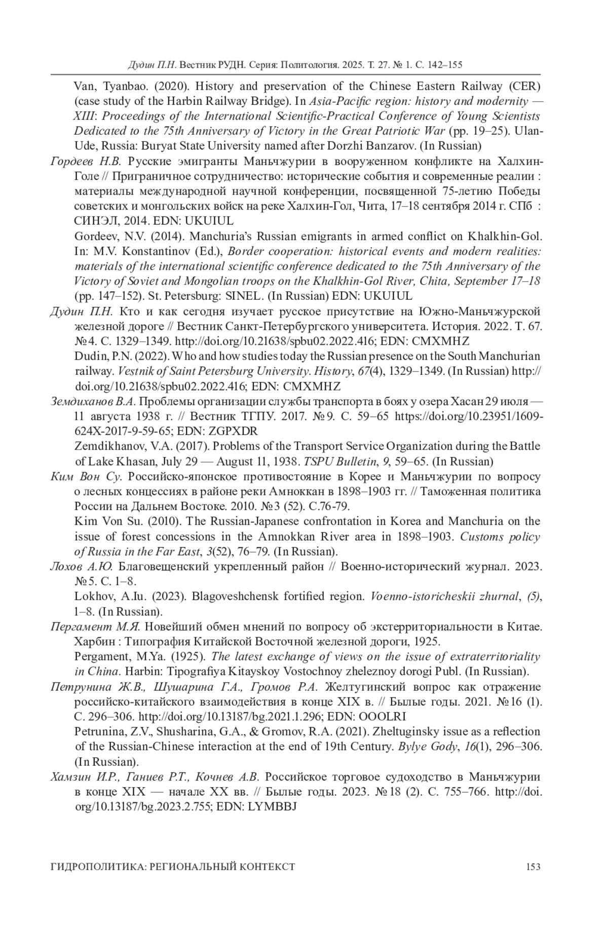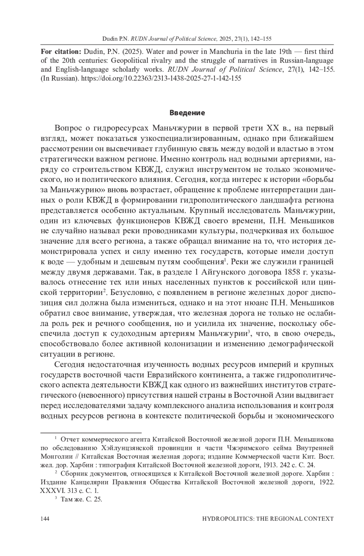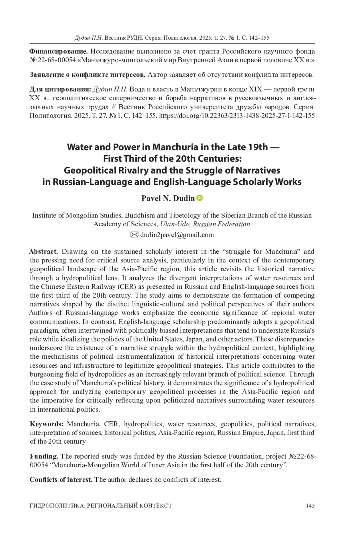 ДУДИН П. Н. ВОДА И ВЛАСТЬ В МАНЬЧЖУРИИ В КОНЦЕ ХIХ - ПЕРВОЙ ТРЕТИ XX В.: ГЕОПОЛИТИЧЕСКОЕ СОПЕРНИЧЕСТВО И БОРЬБА НАРРАТИВОВ В РУССКОЯЗЫЧНЫХ И АНГЛОЯЗЫЧНЫХ НАУЧНЫХ ТРУДАХ // ВЕСТНИК РОССИЙСКОГО УНИВЕРСИТЕТА ДРУЖБЫ НАРОДОВ. СЕРИЯ: ПОЛИТОЛОГИЯ. 2025. Т. 27 № 1