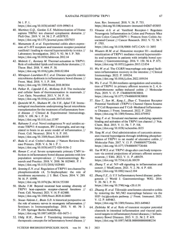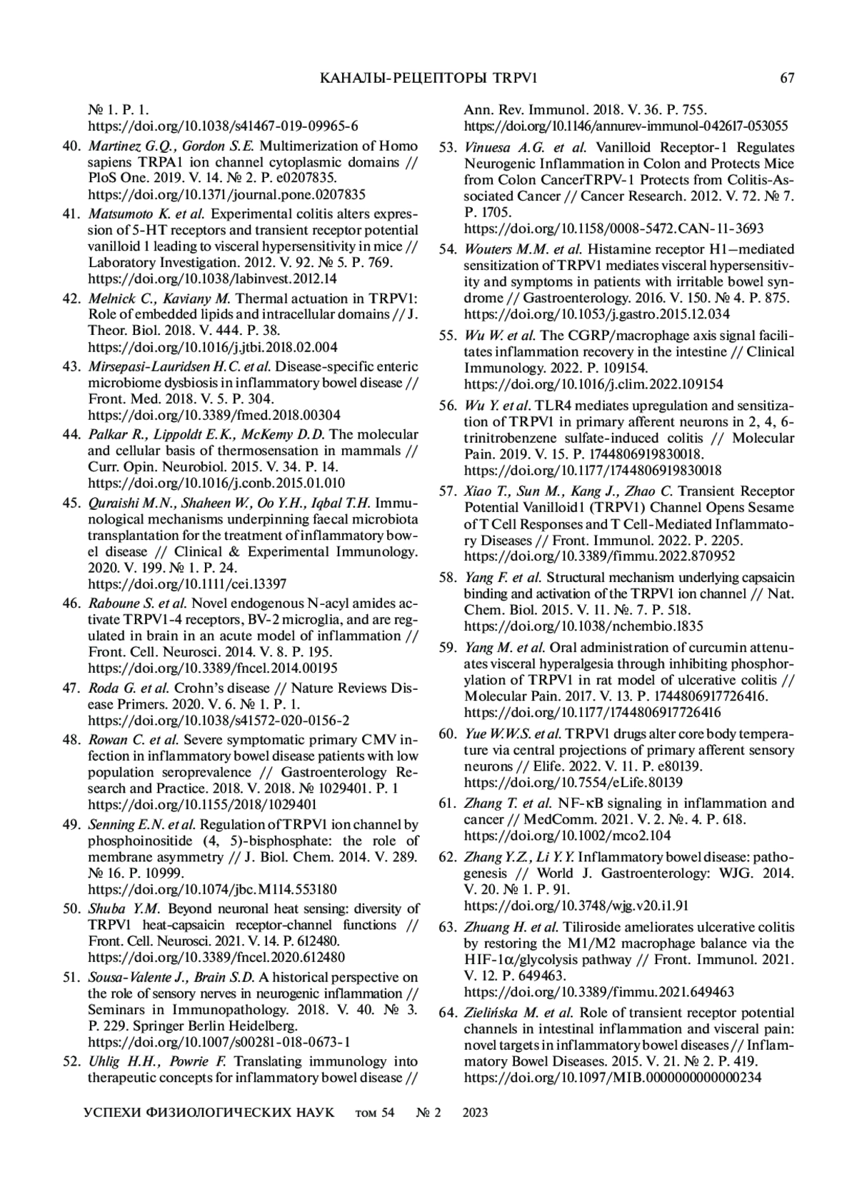 64. Zielińska M. et al. Role of transient receptor potential channels in intestinal inflammation and visceral pain: novel targets in inflammatory bowel diseases // Inflammatory Bowel Diseases. 2015. V. 21. № 2. P. 419. DOI: 10.1097/MIB.0000000000000234