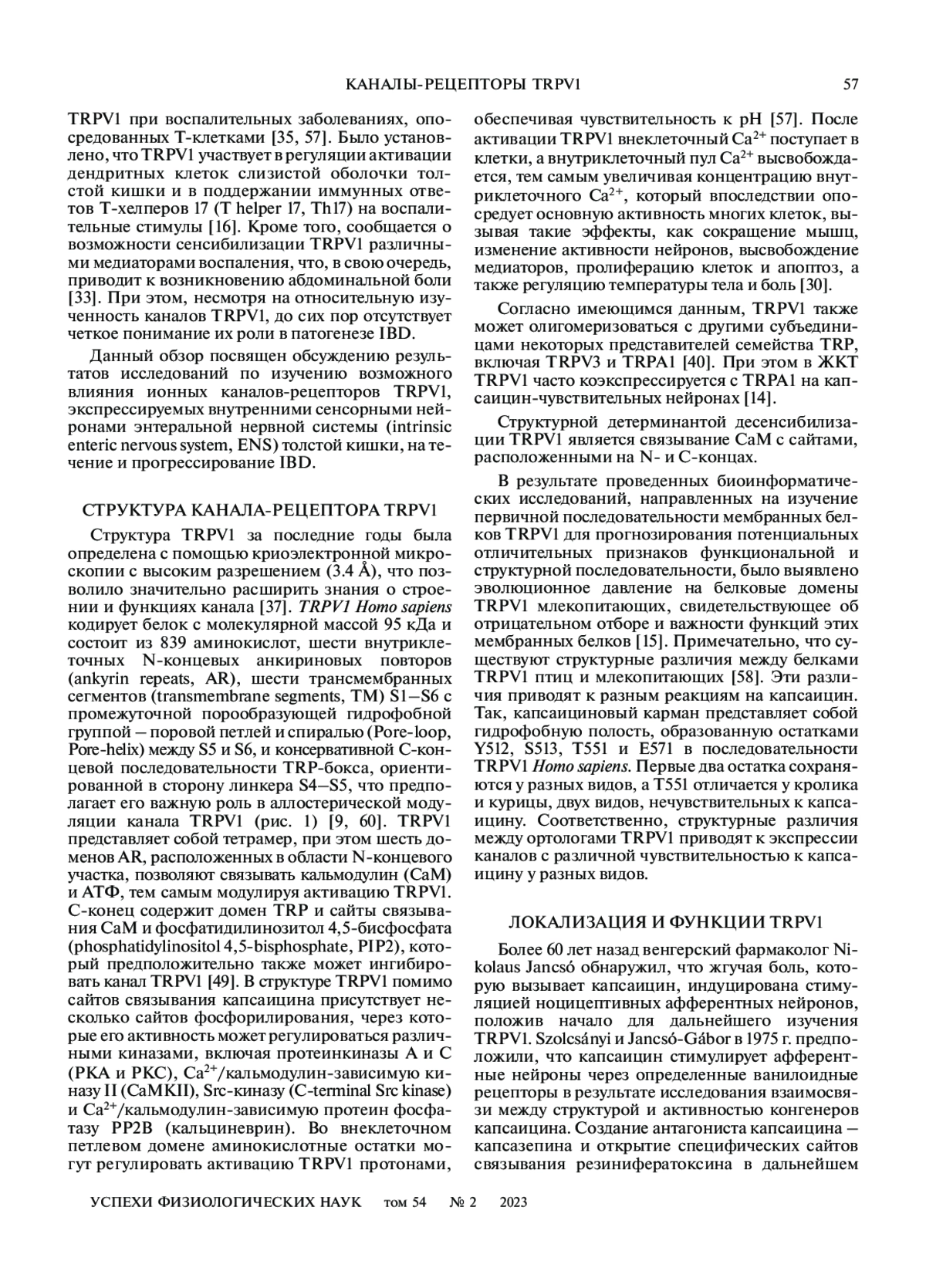 57. Xiao T., Sun M., Kang J., Zhao C. Transient Receptor Potential Vanilloid1 (TRPV1) Channel Opens Sesame of T Cell Responses and T Cell-Mediated Inflammatory Diseases // Front. Immunol. 2022. P. 2205. DOI: 10.3389/fimmu.2022.870952 EDN: LDRFAB