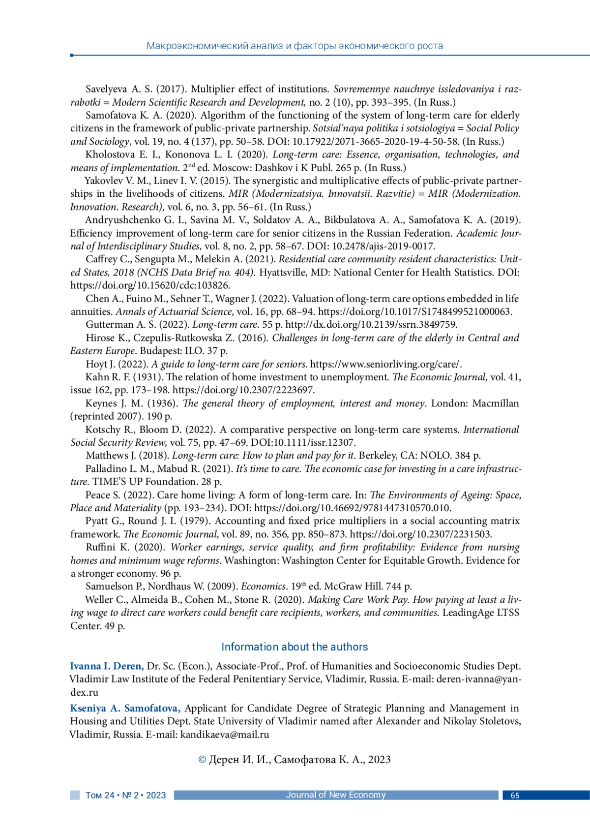13. Andryushchenko G. I., Savina M. V., Soldatov A. A., Bikbulatova A. A., Samofatova K. A. (2019). Efficiency improvement of long-term care for senior citizens in the Russian Federation. Academic Journal of Interdisciplinary Studies, vol. 8, no. 2, pp. 58-67. DOI: 10.2478/ajis-2019-0017 EDN: IOIIWM