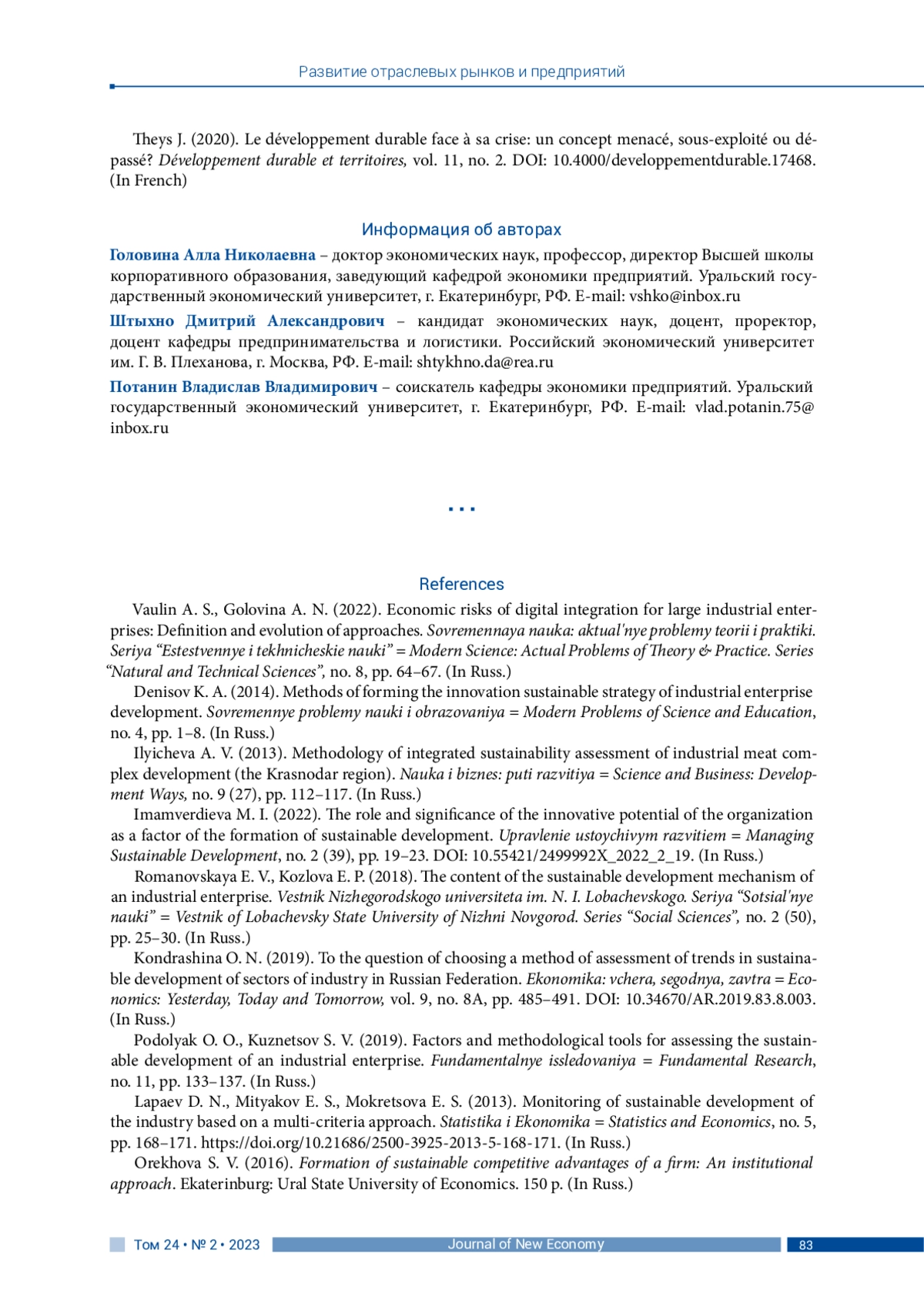 1. Ваулин А. С., Головина А. Н. (2022). Экономические риски цифровой интеграции для крупных промышленных предприятий: дефиниция и эволюция подходов // Современная наука: актуальные проблемы теории и практики. Серия “Естественные и технические науки”. № 8. С. 64-67. EDN: VHKSTR