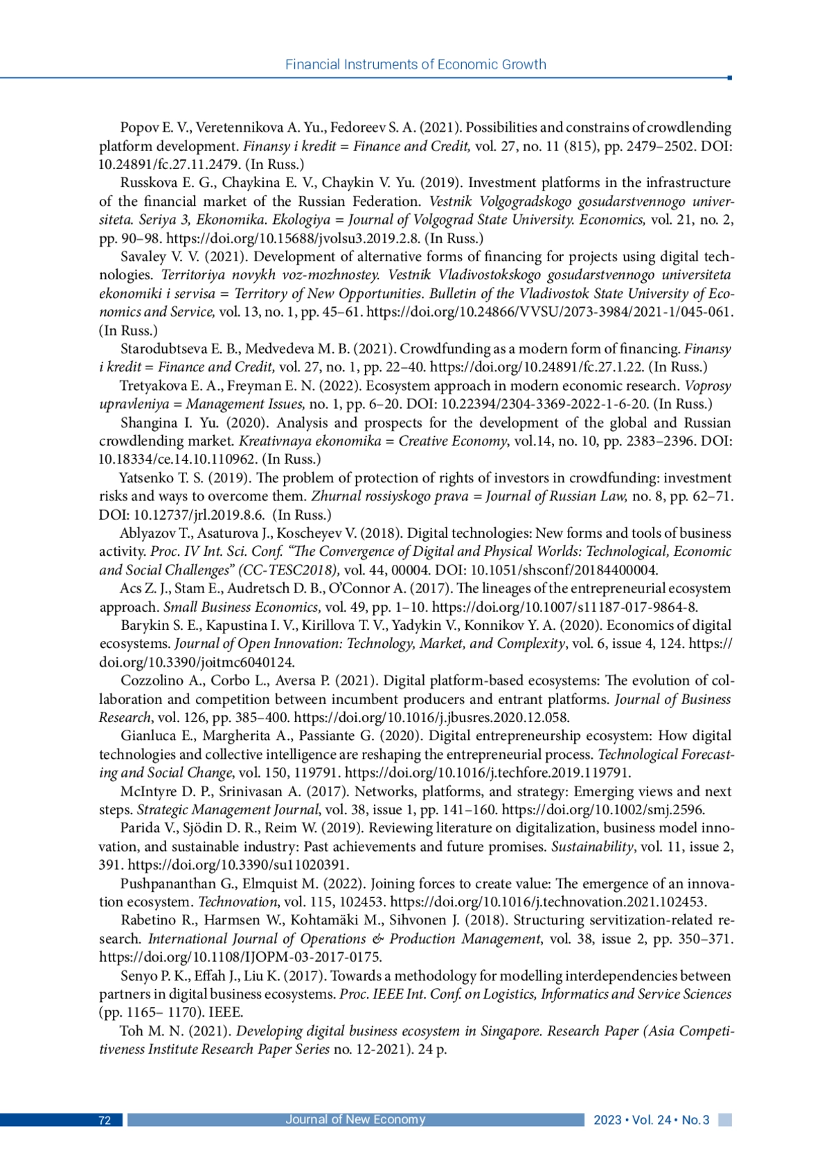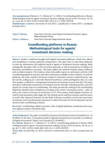 Статья: КРАУДФАНДИНГОВЫЕ ПЛАТФОРМЫ В РФ: МЕТОДИЧЕСКИЙ ИНСТРУМЕНТАРИЙ ДЛЯ ПРИНЯТИЯ АГЕНТАМИ ИНВЕСТИЦИОННЫХ РЕШЕНИЙ (2023)