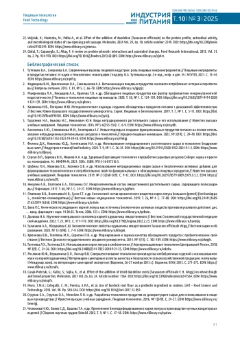 9. Shubina, L.N.; Ivanova, Ye.Ye.; Kosenko, O.V. i dr. Ispol’zovaniye netraditsionnykh vidov syr’ya i biologicheski aktivnykh dobavok dlya formirovaniya tekhnologicheskikh i potrebitel’skikh svoystv funktsional’nykh i obogashchennykh pishchevykh produktov [Use of non-traditional types of raw materials and biologically active additives to form technological and consumer properties of functional and fortified food products]. Izvestiya vysshikh uchebnykh zavedeniy. Pishchevaya tekhnologiya. 2019. No. 2-3(368-369). Pp. 9-12. 10.26297/0579-3009.2019.2-3.2. (in Russ.). DOI: 10.26297/0579-3009.2019.2-3.2.EDN EDN: WVUFLF