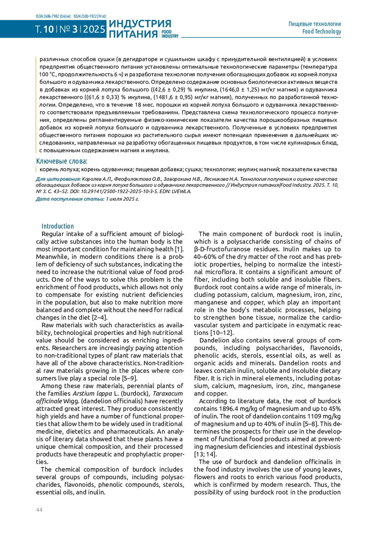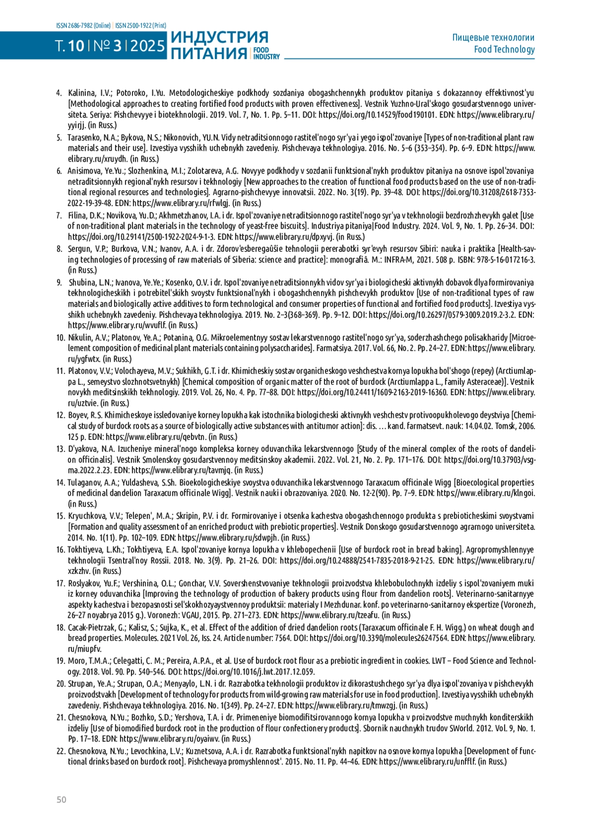 22. Chesnokova, N.Yu.; Levochkina, L.V.; Kuznetsova, A.A. i dr. Razrabotka funktsional’nykh napitkov na osnove kornya lopukha [Development of functional drinks based on burdock root]. Pishchevaya promyshlennost’. 2015. No. 11. Pp. 44-46. (in Russ.). EDN: UNFFLF