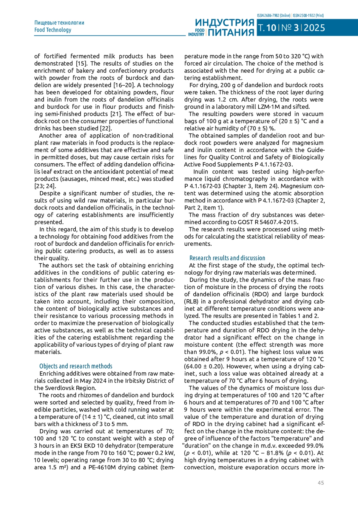 Enrichment of food products with non-traditional plant raw materials, characterized by availability and high nutritional value due to the content of biologically active substances, is a relevant area of research in the field of technology of food systems with a given composition and properties. Burdock root and dandelion root are distinguished by a rich mineral composition, high content of fiber and inulin, which determines the possibility of their use for enrichment of food products. In this regard, the purpose of the study boils down to developing a technology for obtaining powders from burdock root and dandelion in a catering establishment for the production of food products, as well as assessing their quality and safety. As a result of using various drying methods (in a dehydrator and a drying cabinet with forced ventilation) in the conditions of a public catering establishment, optimal process parameters were established (temperature 100 °C, duration 6 h) and a technology for obtaining enriching additives from the roots of burdock and dandelion was developed. The content of the main biologically active substances in additives from the roots of burdock ((42.6 ± 0.29) % inulin, (1646.0 ± 1.25) mg/kg magnesium) and dandelion ((61.6 ± 0.33) % inulin, (1481.6 ± 0.95) mg/kg magnesium), obtained according to the developed technology, was determined. The authors determined that over 18 months the powders from the roots of burdock and dandelion met the requirements. The scheme of the technological process of obtaining is presented, regulated physical and chemical indicators of quality of powdered food additives from the roots of burdock and dandelion are determined. Powders from plant raw materials obtained in the conditions of a public catering enterprise have potential for use in further research aimed at developing fortified food products, including culinary dishes, with increased content of magnesium and inulin