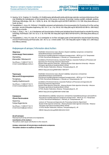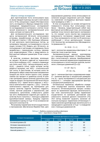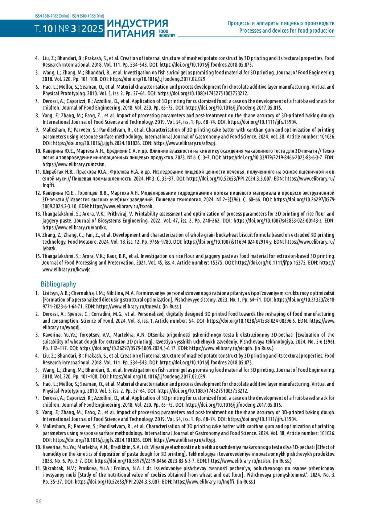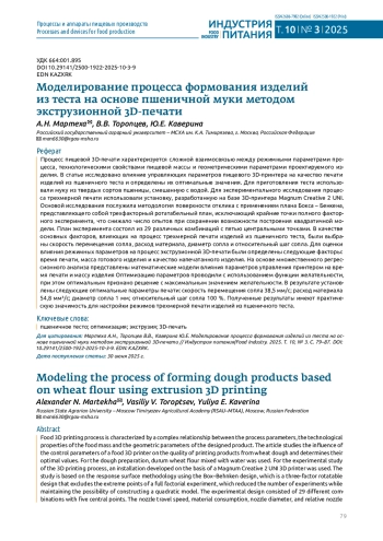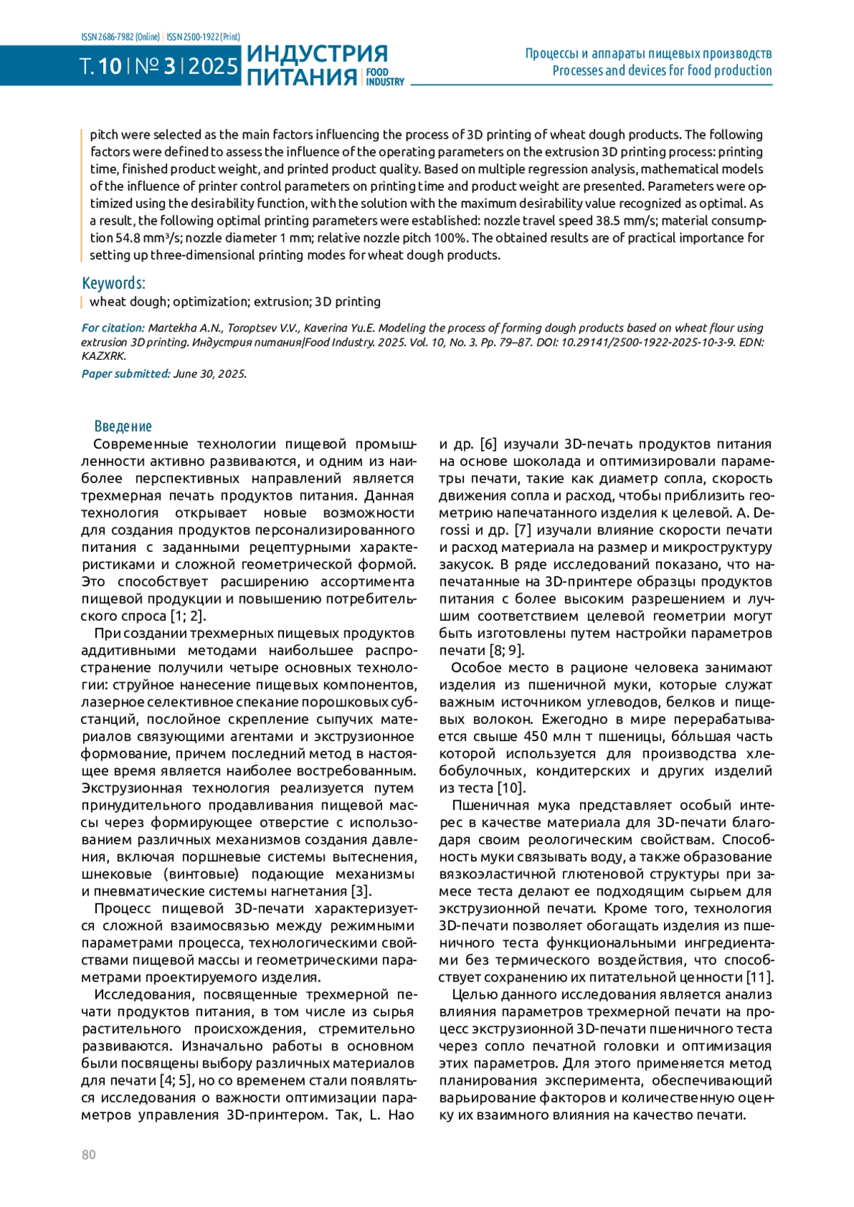 Статья: МОДЕЛИРОВАНИЕ ПРОЦЕССА ФОРМОВАНИЯ ИЗДЕЛИЙ ИЗ ТЕСТА НА ОСНОВЕ ПШЕНИЧНОЙ МУКИ МЕТОДОМ ЭКСТРУЗИОННОЙ 3D-ПЕЧАТИ (2025)
