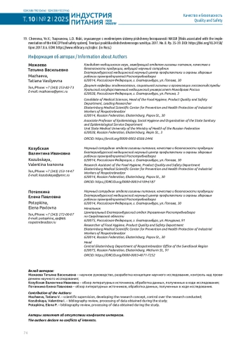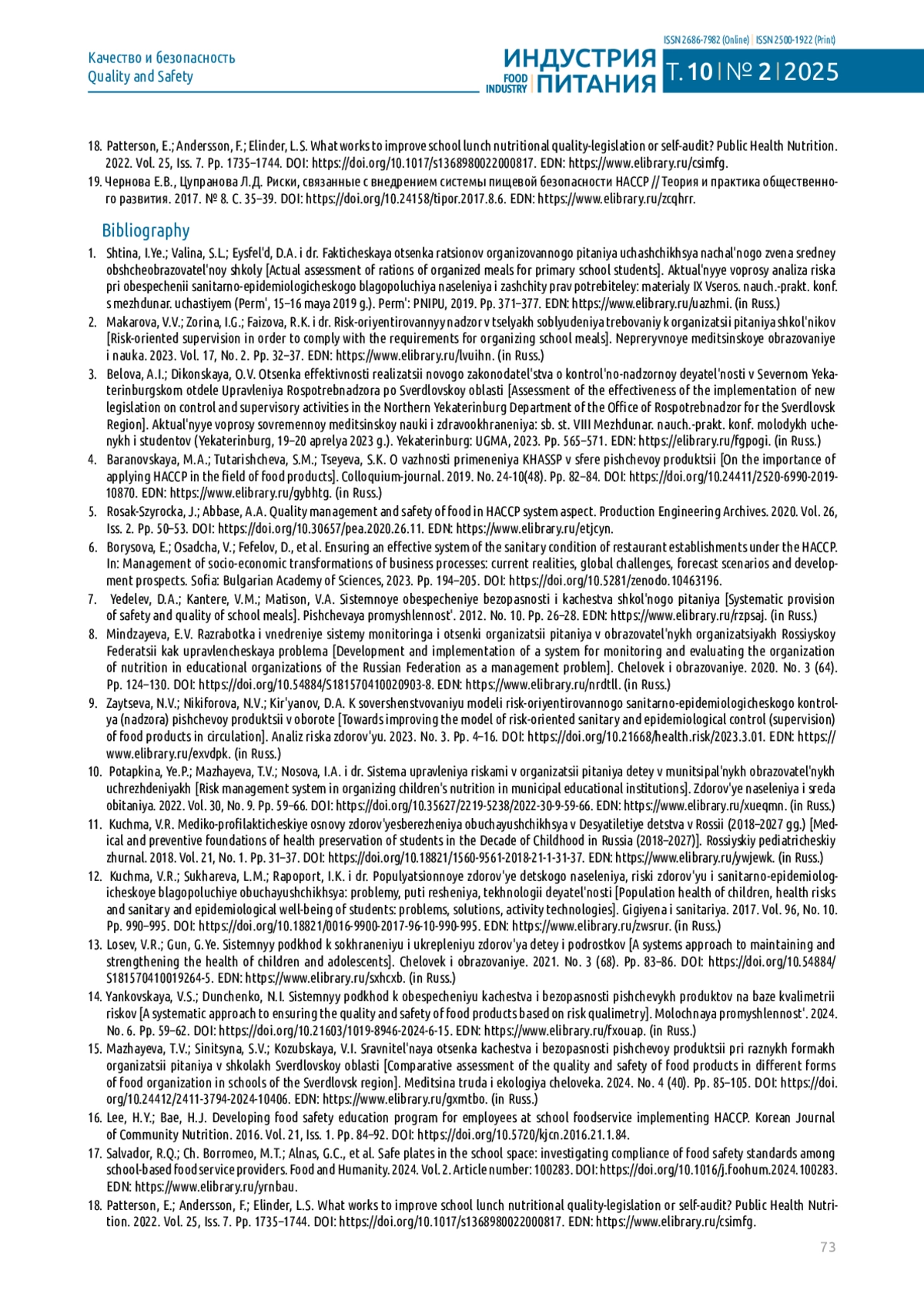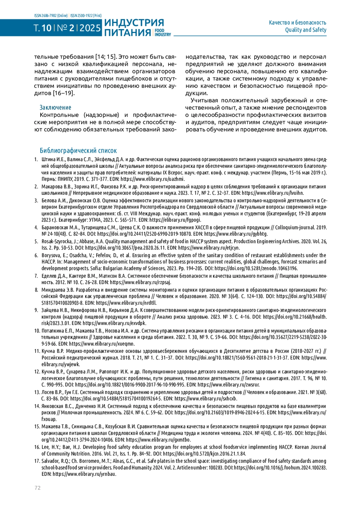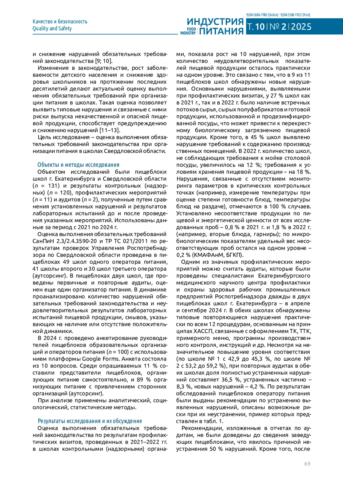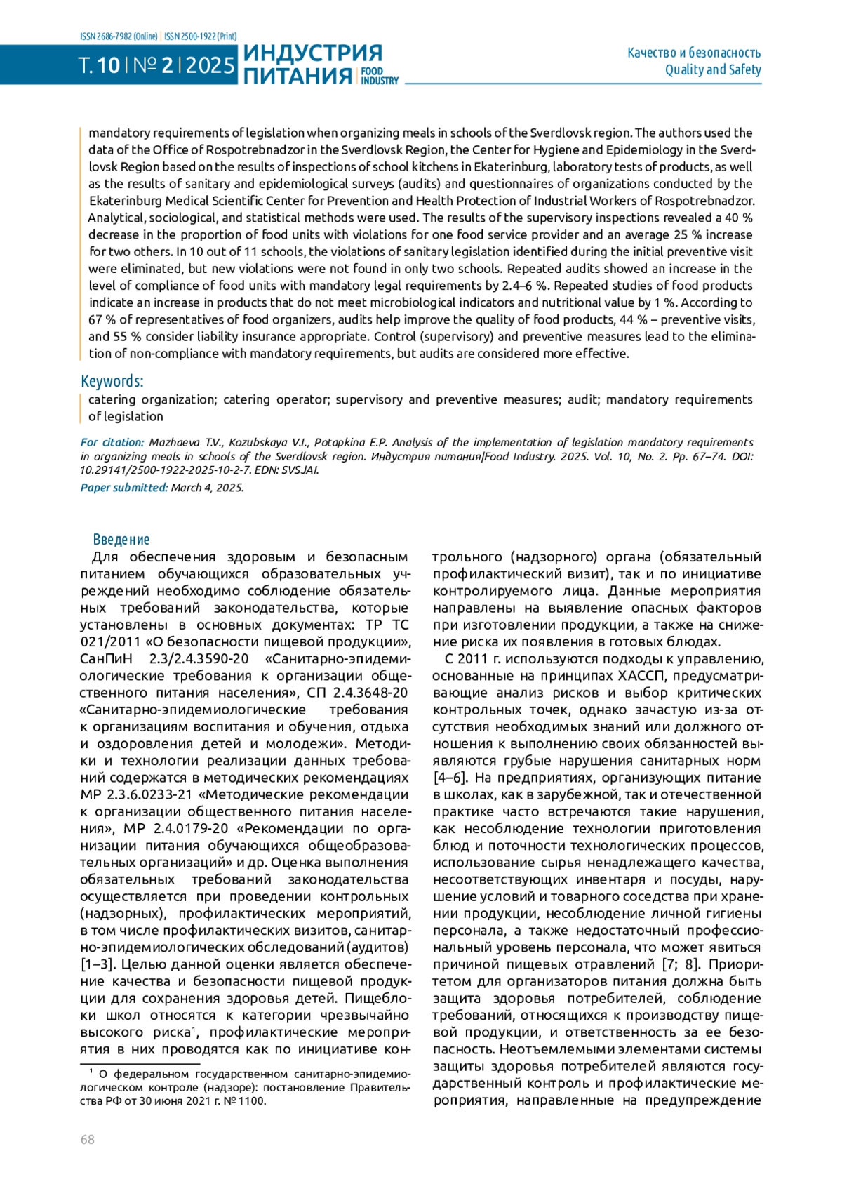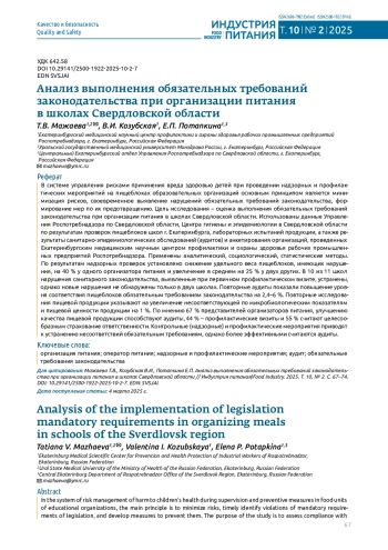 МАЖАЕВА Т. В., КОЗУБСКАЯ В. И., ПОТАПКИНА Е. П. АНАЛИЗ ВЫПОЛНЕНИЯ ОБЯЗАТЕЛЬНЫХ ТРЕБОВАНИЙ ЗАКОНОДАТЕЛЬСТВА ПРИ ОРГАНИЗАЦИИ ПИТАНИЯ В ШКОЛАХ СВЕРДЛОВСКОЙ ОБЛАСТИ // ИНДУСТРИЯ ПИТАНИЯ. 2025. Т. 10 № 2