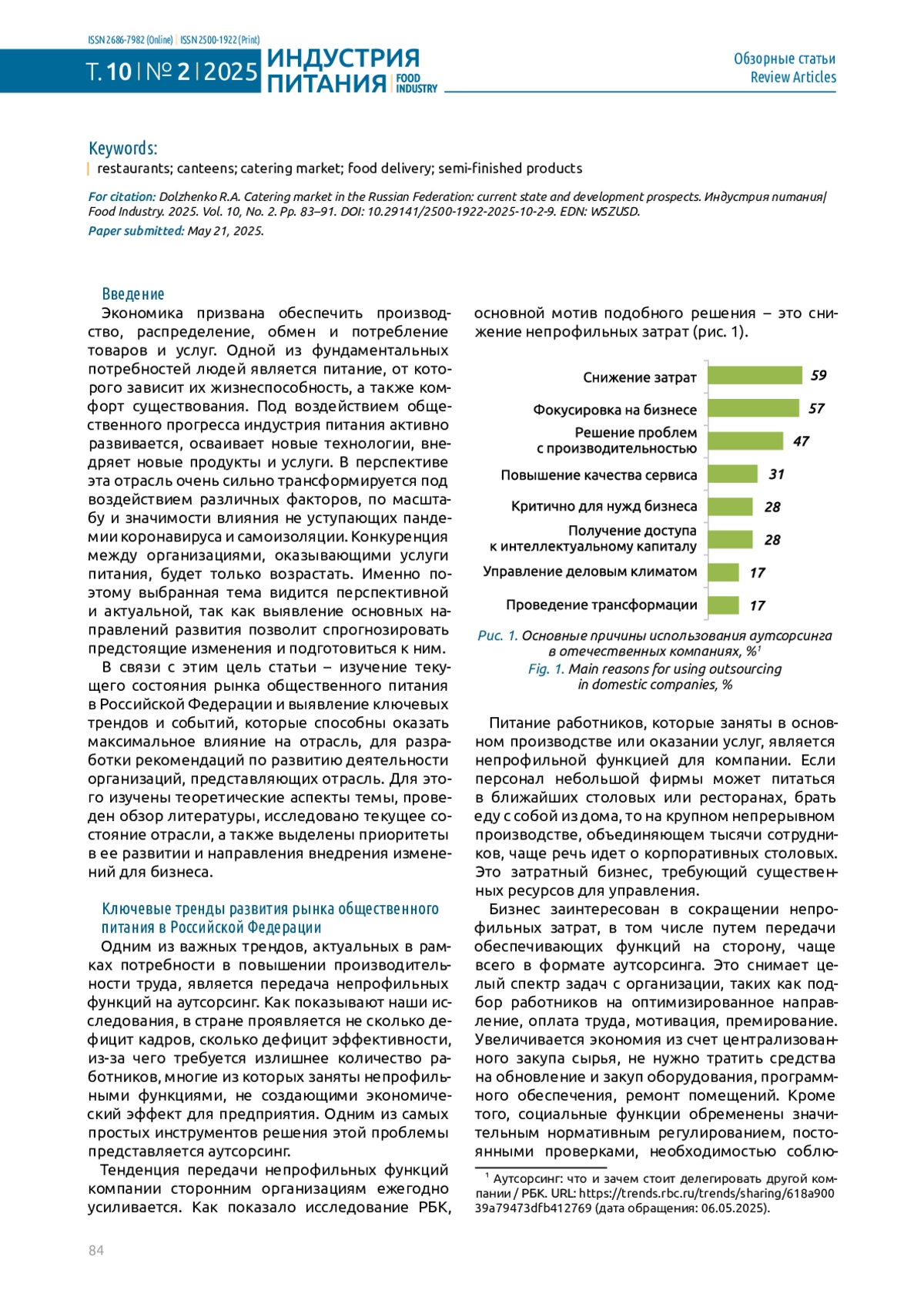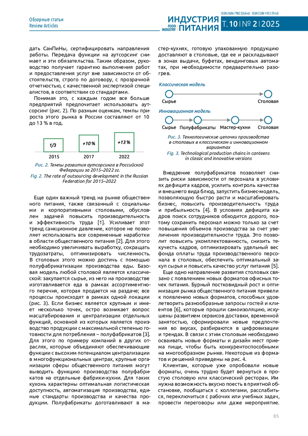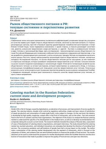 Современная жизнь насыщена изменениями, вызванными цифровизацией, ускорением процессов, улучшением качества сервиса для людей. Отрасль общественного питания, несмотря на жесткий контроль со стороны регулирующих органов, простой и базовый характер удовлетворения потребностей (изготовление и потребление готовой пищи), также подвержена изменениям. С одной стороны, в отрасли доминирует качественное, дорогое, уникальное предложение в виде ресторанов, а с другой – быстрое и универсальное питание в виде столовых и организаций фастфуда. Цель исследования – проанализировать рынок общественного питания Российской Федерации для понимания особенностей его развития в среднесрочной перспективе, а также разработать рекомендации для компаний с учетом актуальных трендов. Методы исследования включали анализ данных Росстата, оценку кейсов развития организаций отрасли общественного питания, экспертные интервью. Исследование показало, что рынок общественного питания достиг насыщения, на нем появляются отдельные инновации, которые развивают направление предоставления услуг питания. Сильное влияние на рынок оказали пандемия коронавируса и самоизоляция людей. Отмечается поляризация развития рынка общественного питания на сегмент ресторанов, который ориентирован на уникальность блюд, и столовых, использующих полуфабрикатизацию для повышения качества предоставления услуг питания. Полученные результаты могут использоваться для понимания перспектив развития рынка в рамках направления FoodNet и внедрения инноваций, которые дают возможность повысить качество предоставления услуг питания, открыть новые направления