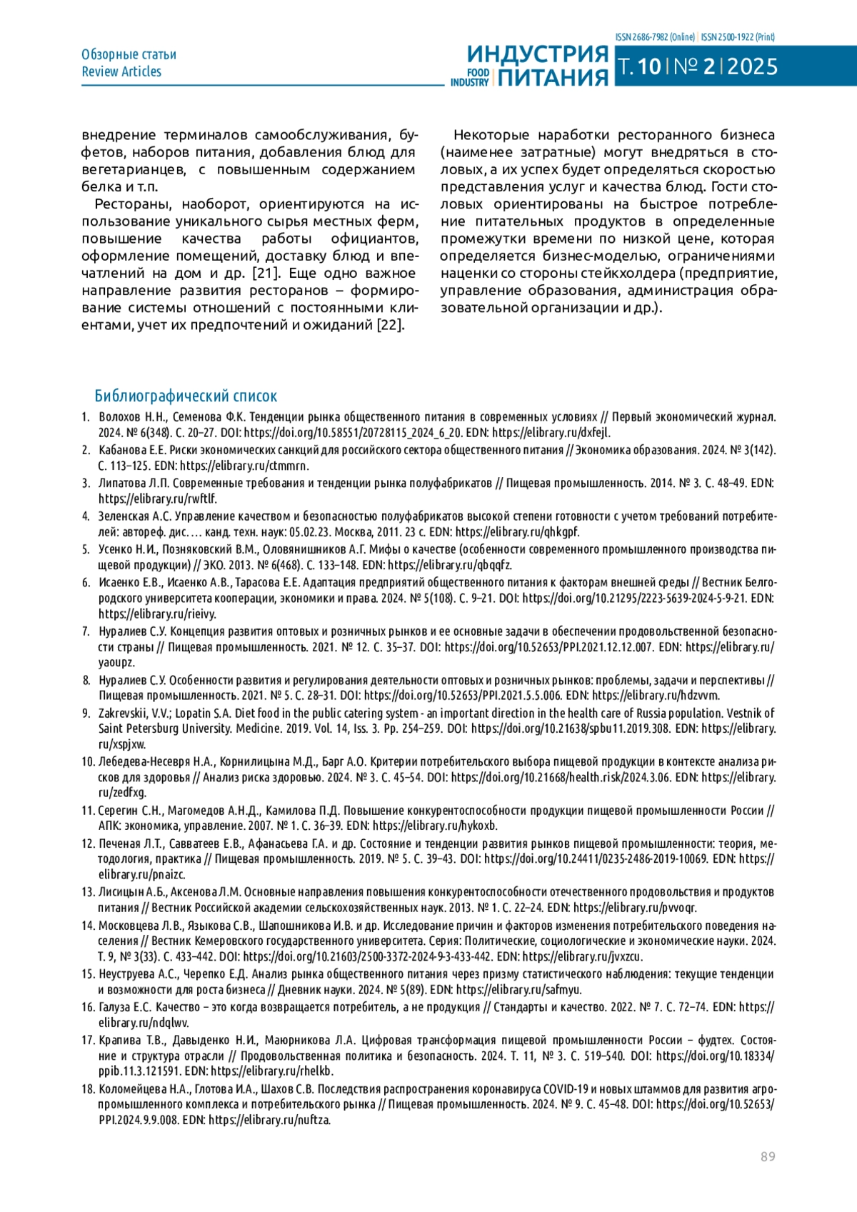 1. Волохов Н.Н., Семенова Ф.К. Тенденции рынка общественного питания в современных условиях // Первый экономический журнал. 2024. № 6(348). С. 20-27. 10.58551/20728115_2024_6_20. DOI: 10.58551/20728115_2024_6_20.EDN EDN: DXFEJL