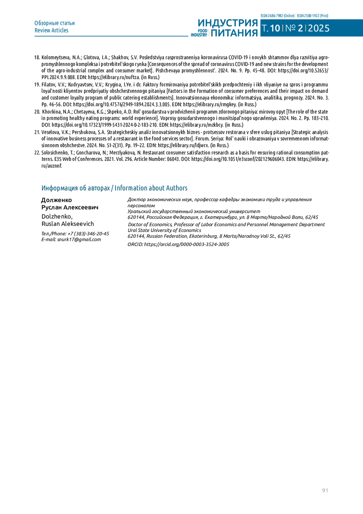 22. Solosichenko, T.; Goncharova, N.; Merzlyakova, N. Restaurant consumer satisfaction research as a basis for ensuring rational consumption patterns. E3S Web of Conferences. 2021. Vol. 296. Article Number: 06043. 10.1051/e3sconf/202129606043. DOI: 10.1051/e3sconf/202129606043.EDN EDN: AUZNNF
