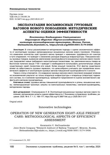 В статье рассматриваются методические подходы к оценке экономического эффекта от эксплуатации грузовых железнодорожных восьмиосных вагонов нового поколения. Отмечено, что изменение количества осей грузового вагона приводит к изменению трудоёмкости его осмотра в пути следования, что приводит к изменению расходов владельца инфраструктуры. Повышение массы грузовых поездов, вызванное увеличением грузоподъёмности восьмиосных вагонов нового поколения, предъявляет новые требования к магистральным локомотивам, так, увеличение массы поезда на Восточном полигоне свыше 7100 т приводит к необходимости использовать дополнительную секцию существующих серий локомотива или новый, более мощный локомотив. Этот фактор существенно влияет на себестоимость грузовых перевозок, что целесообразно учитывать при определении экономического эффекта от эксплуатации грузовых вагонов повышенной грузоподъёмности и осности. Также в статье отмечается, что внедрение грузовых вагонов нового поколения оказывает влияние на экономический результат не только владельца инфраструктуры и владельца (оператора) подвижного состава, но и компании-грузовладельца, приводятся предложения по оценке экономического эффекта для компании-грузовладельца.