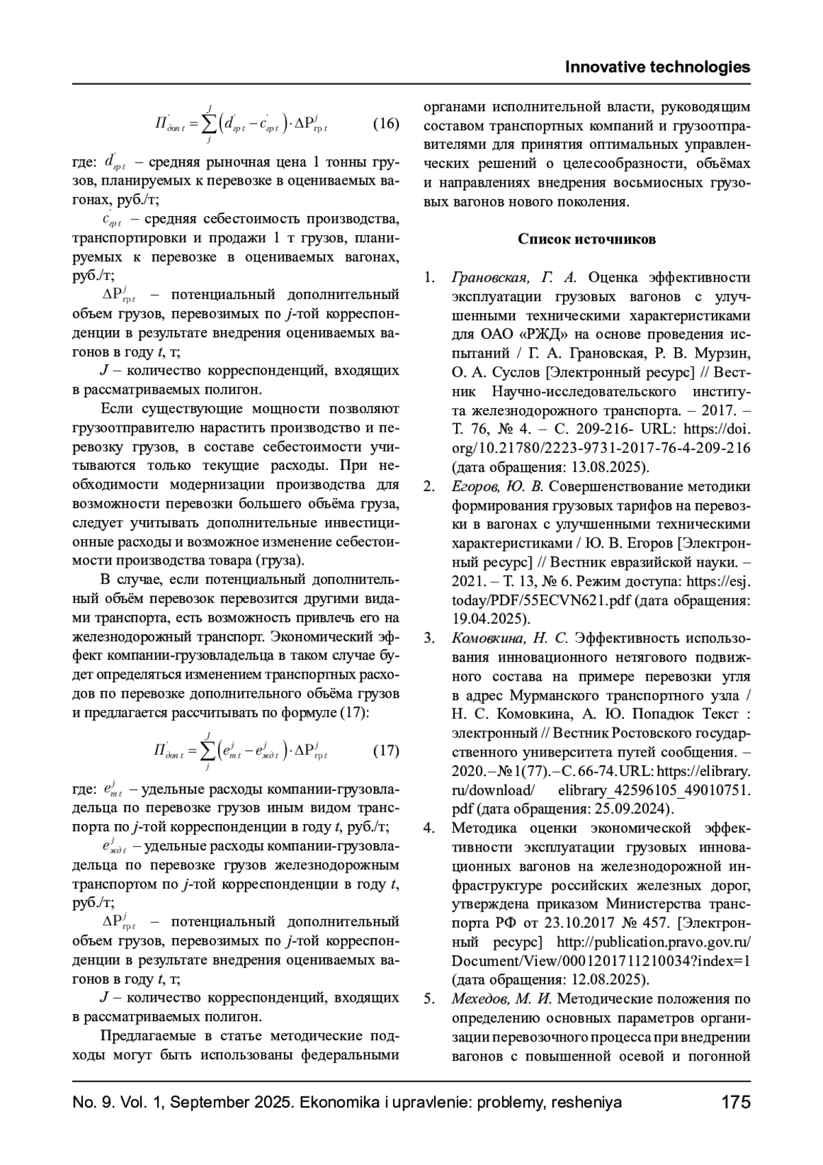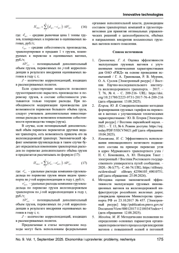 4. Методика оценки экономической эффективности эксплуатации грузовых инновационных вагонов на железнодорожной инфраструктуре российских железных дорог, утверждена приказом Министерства транспорта РФ от 23.10.2017 № 457. [Электронный ресурс] http://publication.pravo.gov.ru/Document/View/0001201711210034?index=1 (дата обращения: 12.08.2025).
