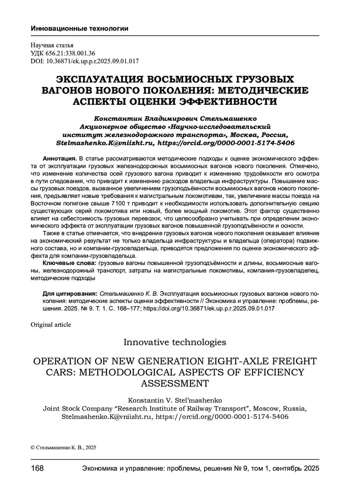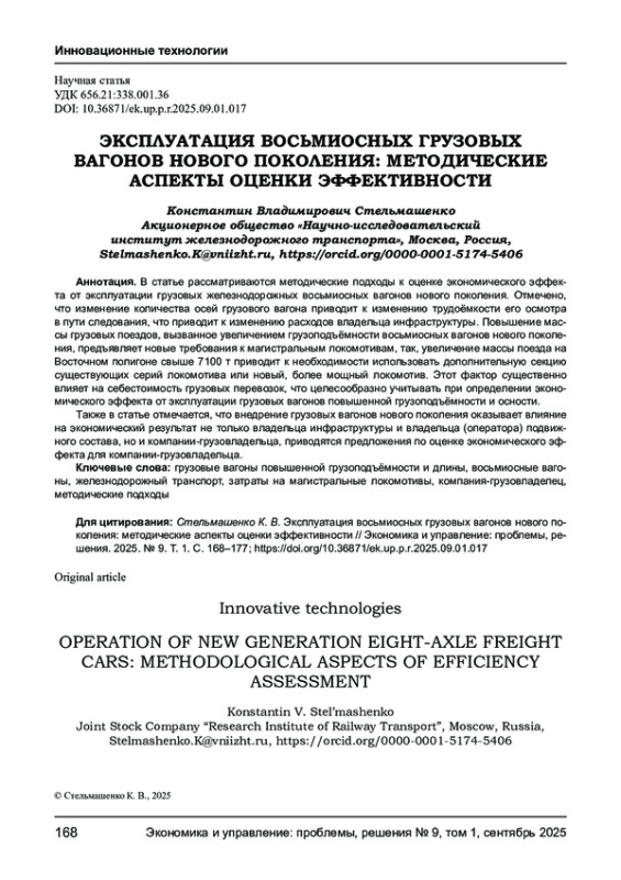 11. Стельмашенко, К. В. Методический подход к оценке инвестиционной составляющей в тарифе на услуги предоставления инфраструктуры железнодорожного транспорта при внедрении восьмиосных вагонов нового поколения [Электронный ресурс] / К. В. Стельмашенко // Транспортное дело России. - 2025. - № 3. - С. 75-77. Режим доступа: item.asp?id=81825000 (дата обращения: 13.08.2025). EDN: YJYMIO